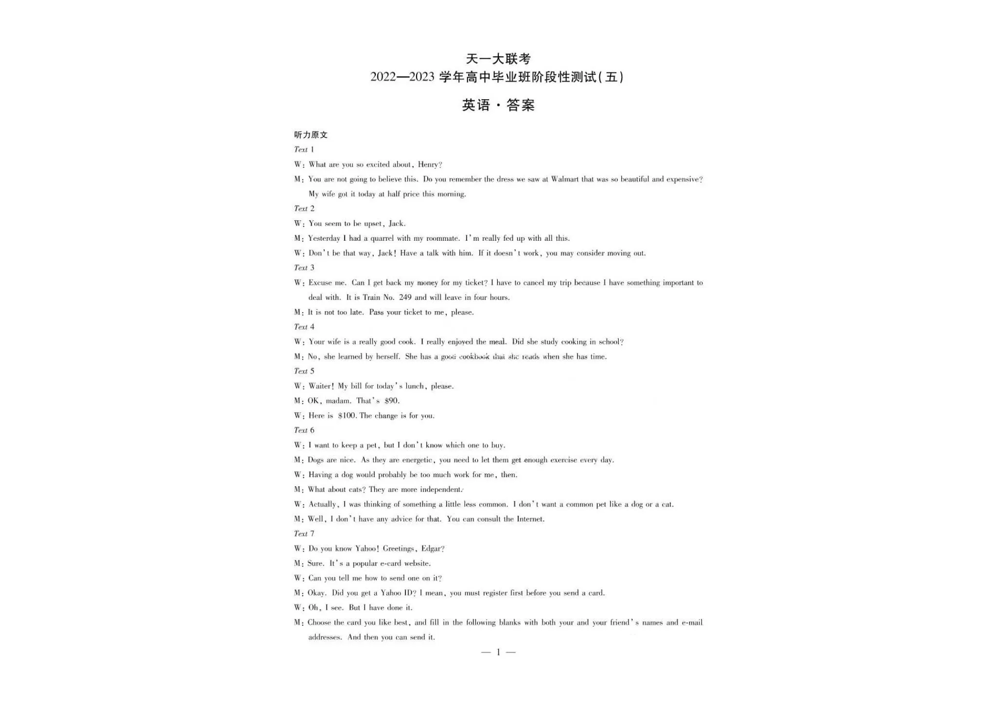 天一大联考2022-2023高三五联英语答案及试题解析在是很多考生都在关注的,大家应该都非常想要知道天一大联考2022-2023高三五联英语科目试题答案,高考100网小编就为大家带来天一大联考2022-2023高三五联英语参考答案及试题解析。