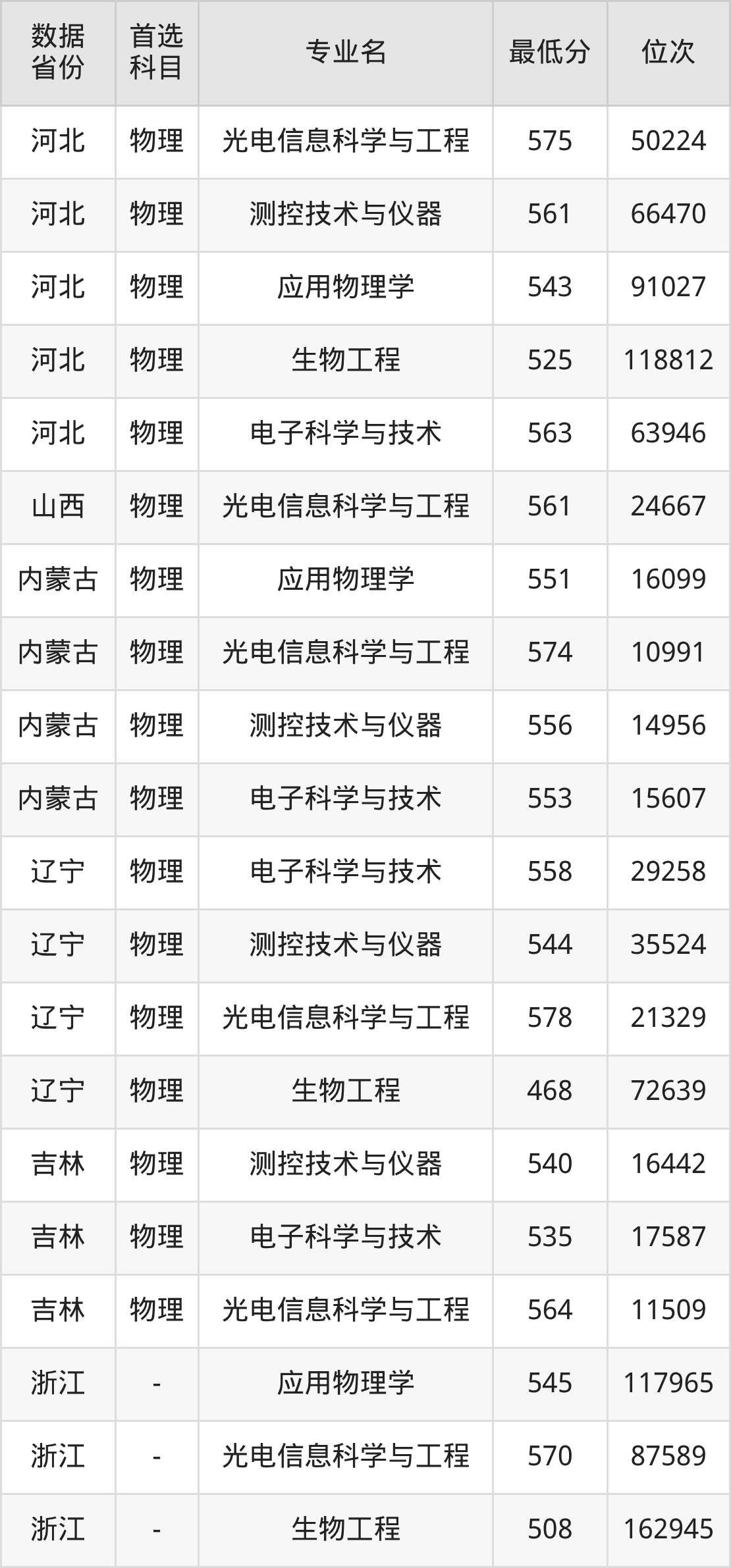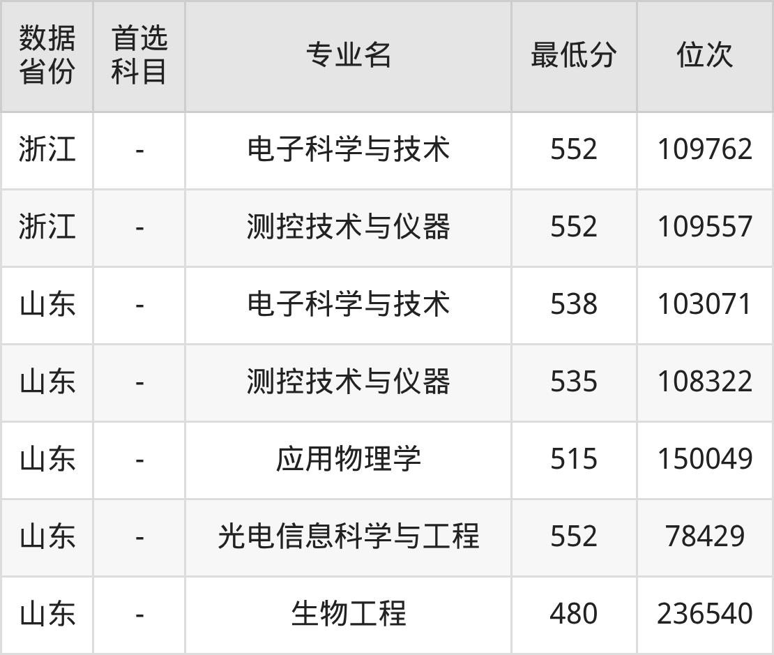 光电信息科学与工程575分、测控技术与仪器561分、应用物理学543分、生物工程525分、电子科学与技术563分。
