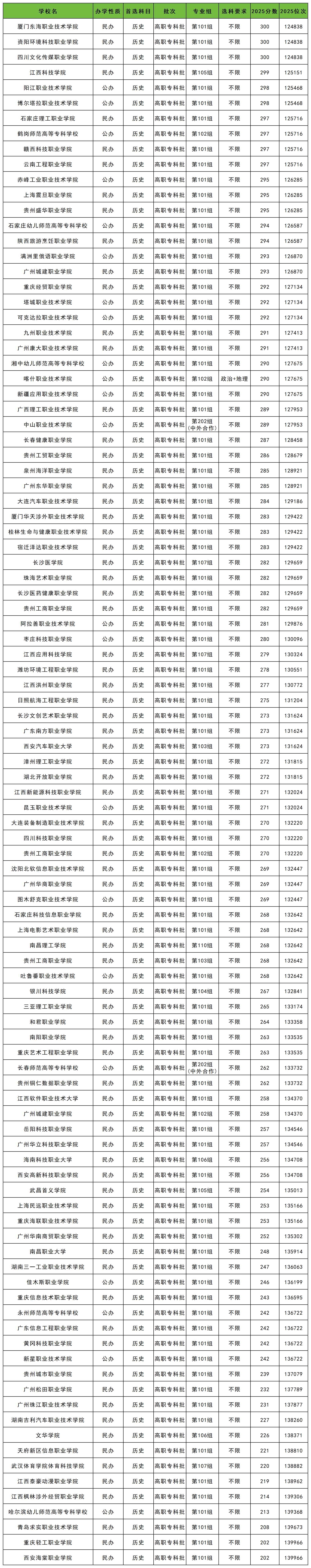 历史类高考200-300分能上的大学全部为专科院校。