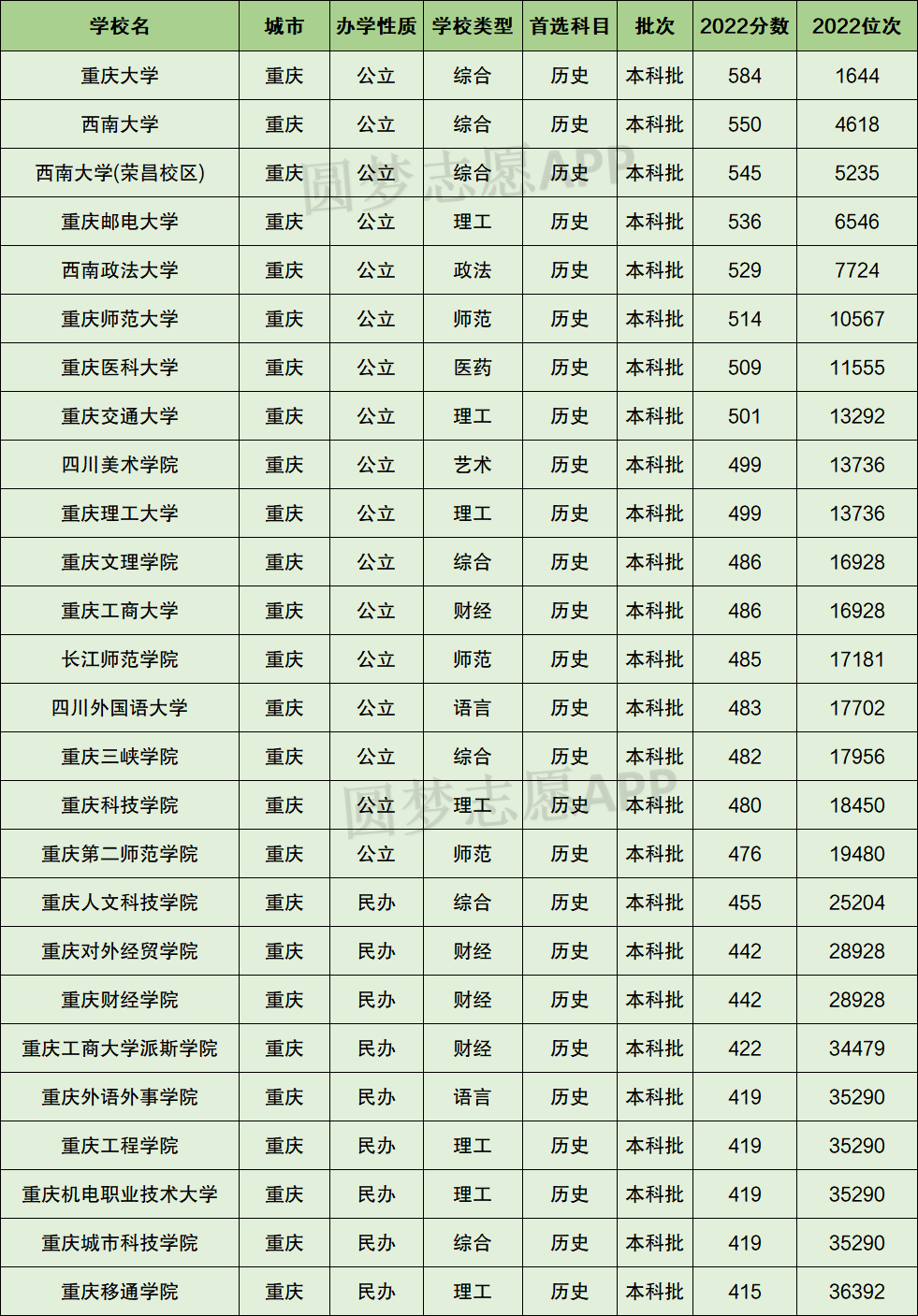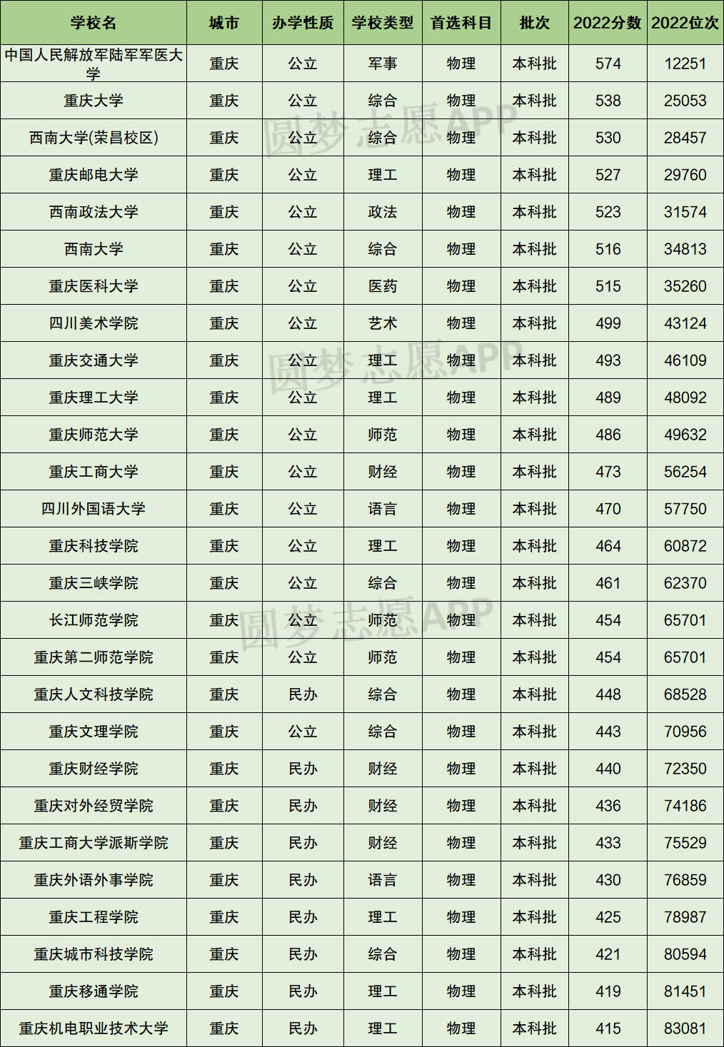 想必很多人关心重庆市高校录取分数线排名,其中就包括重庆市最好最有实力的大学,以及重庆分数最低最好考的大学。本文将介绍2022年各大学录取重庆考生分数线的情况,包括重庆市内院校大学分数线等。