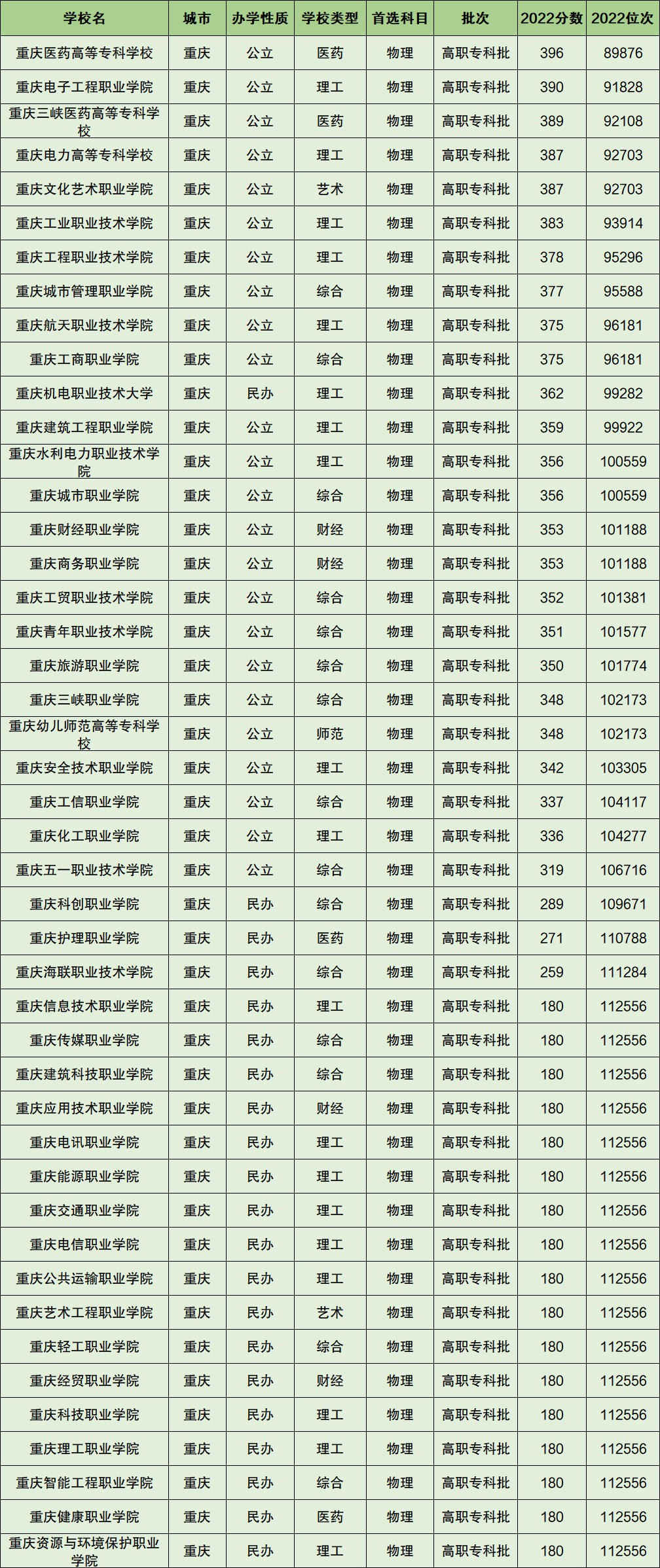 2、重庆市物理类分数最低的专科大学为重庆健康职业学院、重庆智能工程职业学院、重庆资源与环境保护职业学院等17所大学,录取分数为180分、最低录取位次为112556。