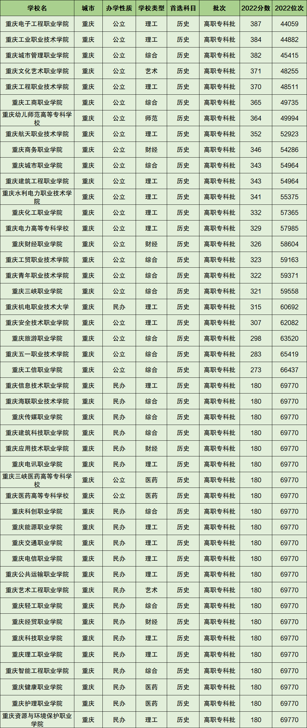 1、重庆市历史类分数最高的专科大学为重庆电子工程职业学院,录取分数线为387分,录取位次为44059;其次为重庆工业职业技术学院,最低分数为384分,对应全省最低位次为44882。