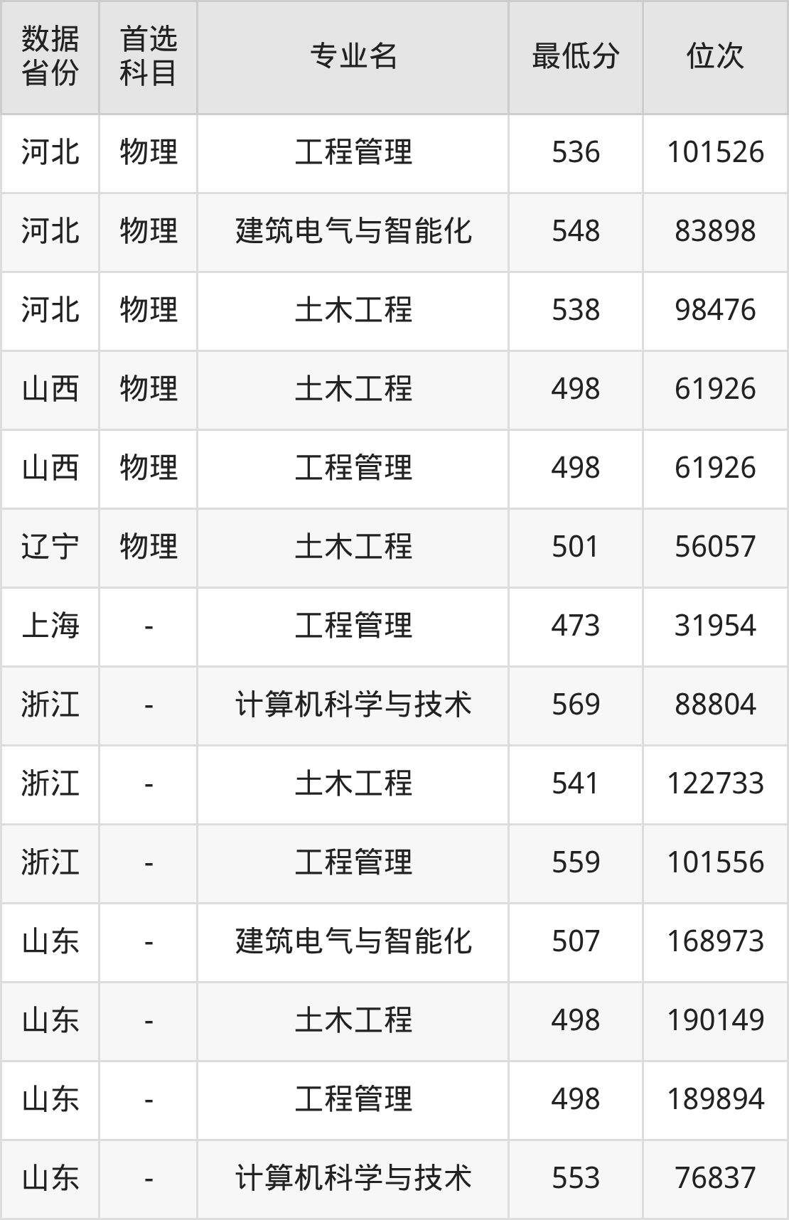 建筑电气与智能化507分、土木工程498分、工程管理498分、计算机科学与技术553分。