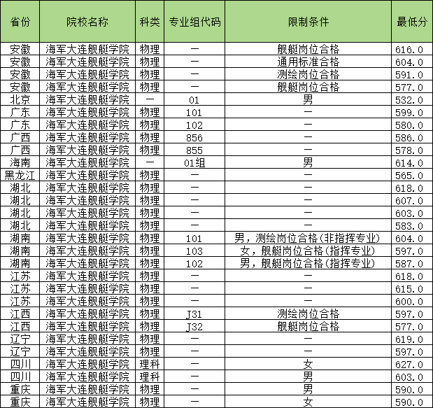 | 海军大连舰艇学院 | 物理 | 003专业组 | 舰艇岗位合格 | 599 |