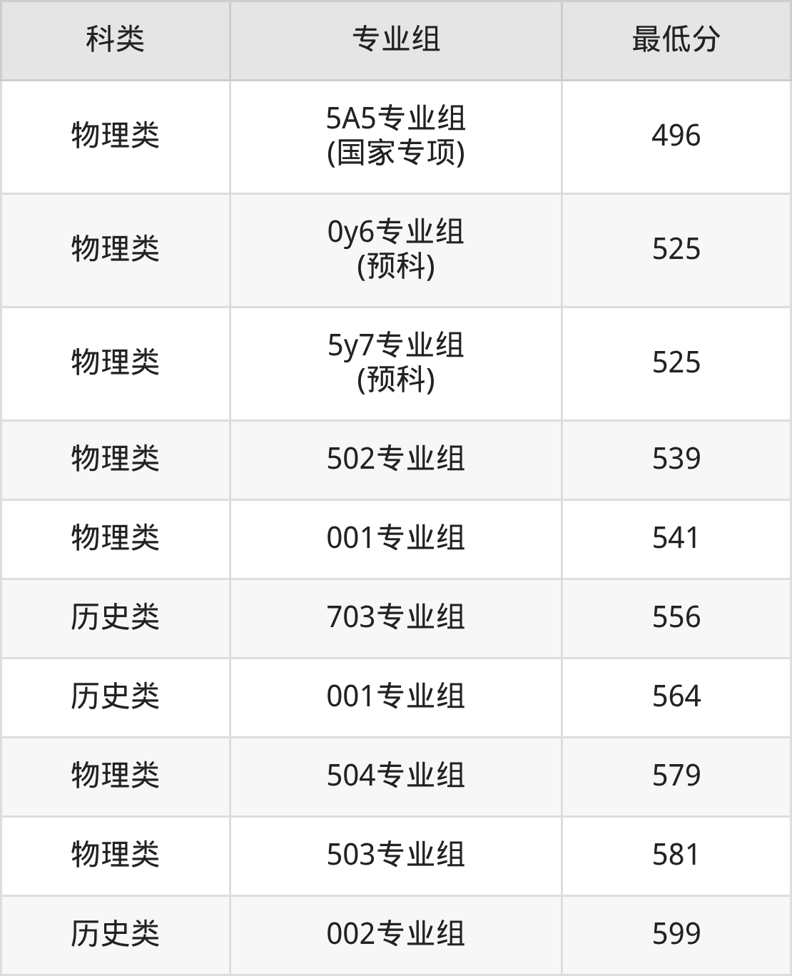 物理类:5A2专业组(国家专项)最低552分、5G3专业组(民族班)最低598分、501专业组最低636分;