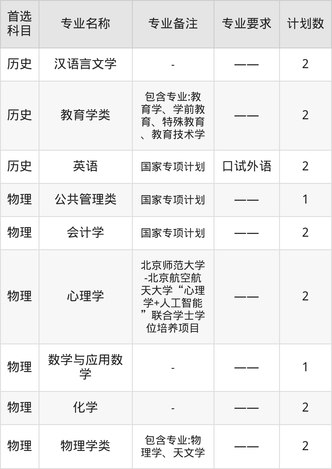 2025年北京师范大学在宁夏招生人数是16人,招生专业包括汉语言文学、教育学类、英语、公共管理类、会计学、心理学、数学与应用数学、化学、物理学类。具体如下图所示: