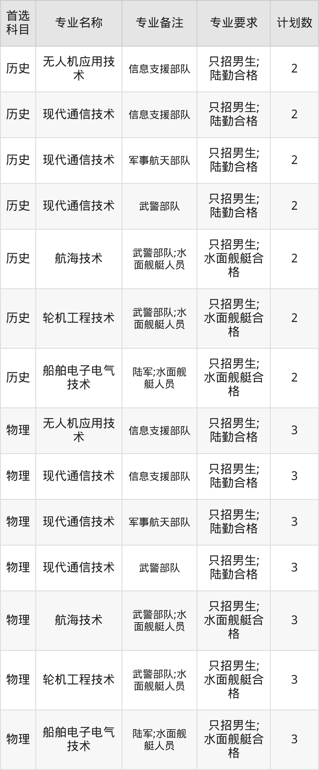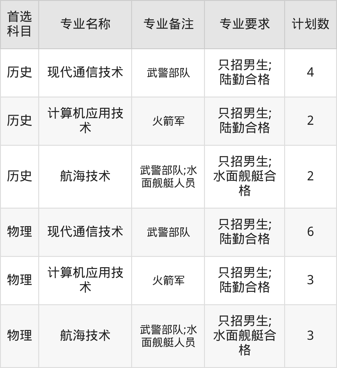 2025年威海职业学院在湖南招生人数是20人,招生专业包括现代通信技术、计算机应用技术、航海技术。具体如下图所示: