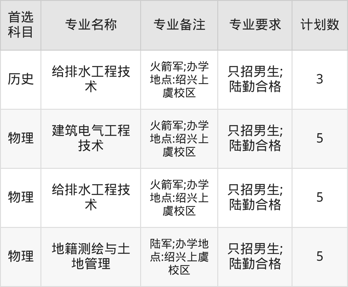 2025年浙江建设职业技术学院在湖南招生人数是18人,招生专业包括给排水工程技术、建筑电气工程技术、地籍测绘与土地管理。具体如下图所示: