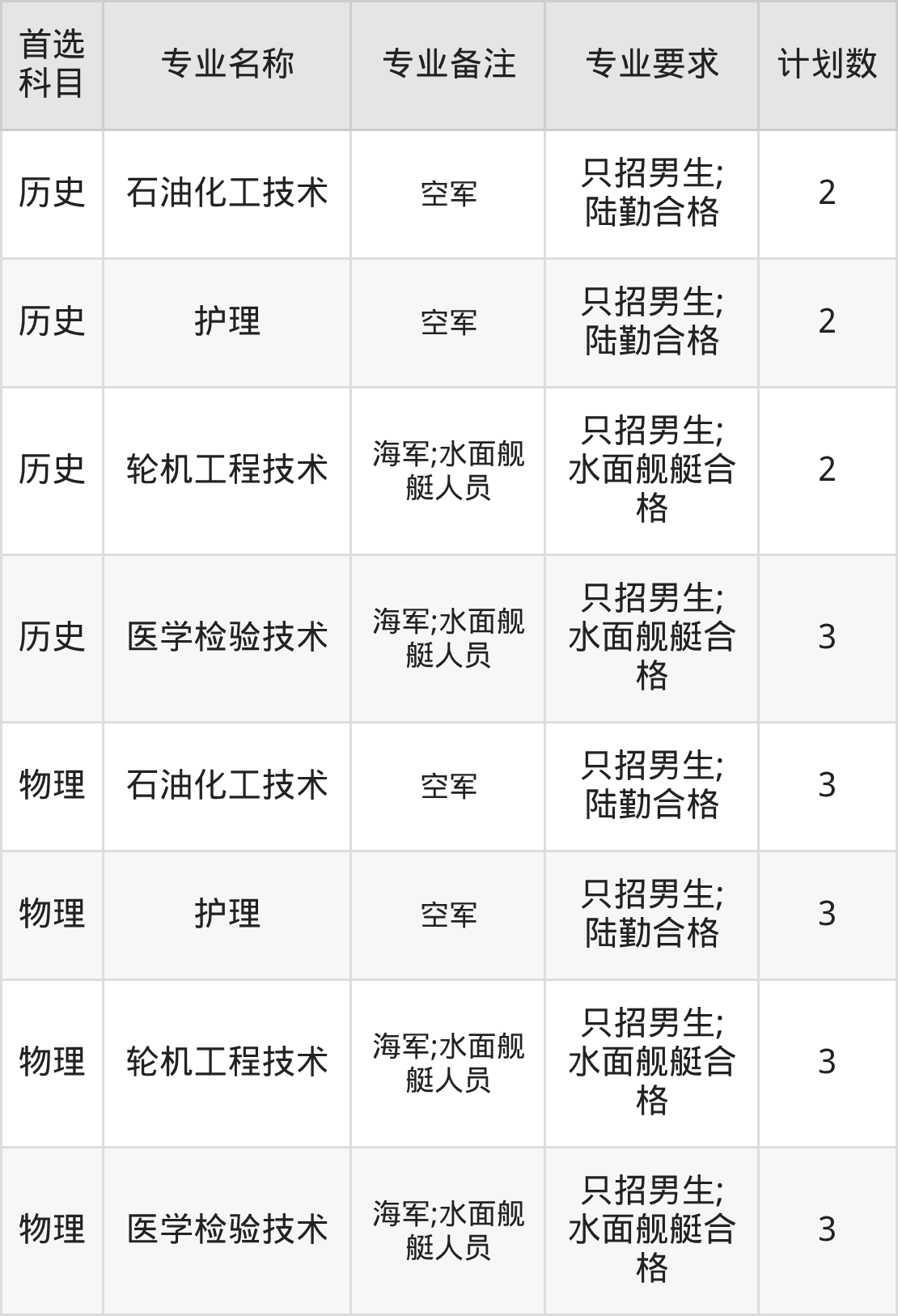 2025年滨州职业技术大学在湖南招生人数是21人,招生专业包括石油化工技术、护理、轮机工程技术、医学检验技术。具体如下图所示:
