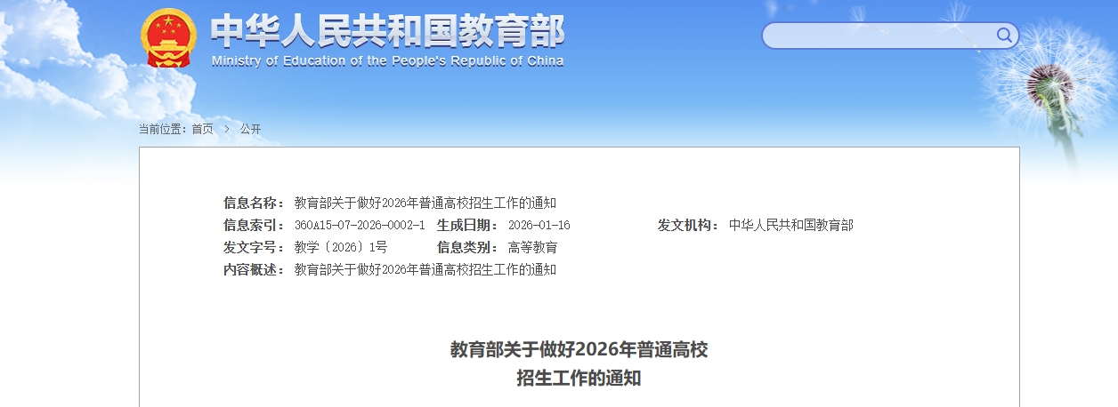 2026年1月22日,教育部发布《教育部关于做好2026年普通高校招生工作的通知》,明确指出2026年普通高等学校招生各环节管理工作,按照《教育部关于做好2025年普通高校招生工作的通知》(教学〔2025〕1号)附件的有关要求执行。
