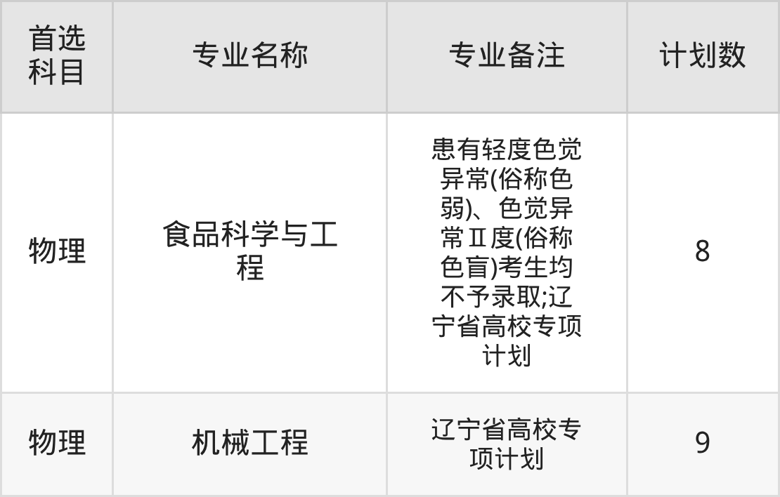 2025年大连工业大学在辽宁招生人数是17人,招生专业包括食品科学与工程、机械工程。具体如下图所示: