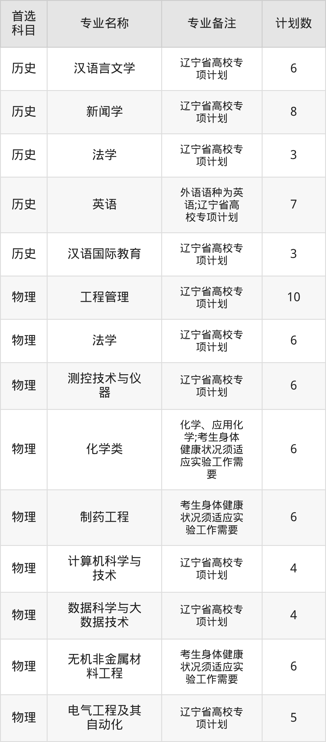 2025年辽宁大学在辽宁招生人数是80人,招生专业包括汉语言文学、新闻学、法学、英语、汉语国际教育、工程管理、测控技术与仪器、化学类、制药工程、计算机科学与技术等。具体如下图所示: