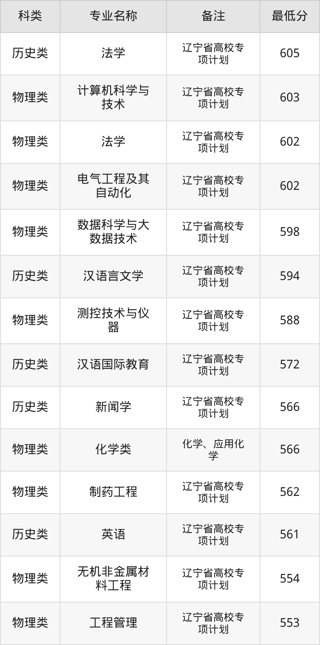 辽宁历史组考生最难考的是法学(辽宁省高校专项计划),2025年最低分605分,超学校该类最低分(561分)44分。最好考的则是英语(辽宁省高校专项计划),2025年最低分是561分。