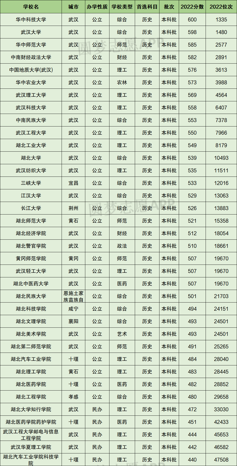 1、湖北省历史类分数最高的本科大学为华中科技大学,最低录取分数线为600,对应最低位次为1335。