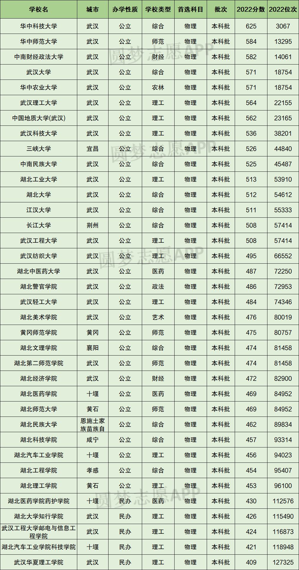 1、湖北省物理类分数最高的本科大学为华中科技大学,最低录取分数线为625,对应最低位次为3067。