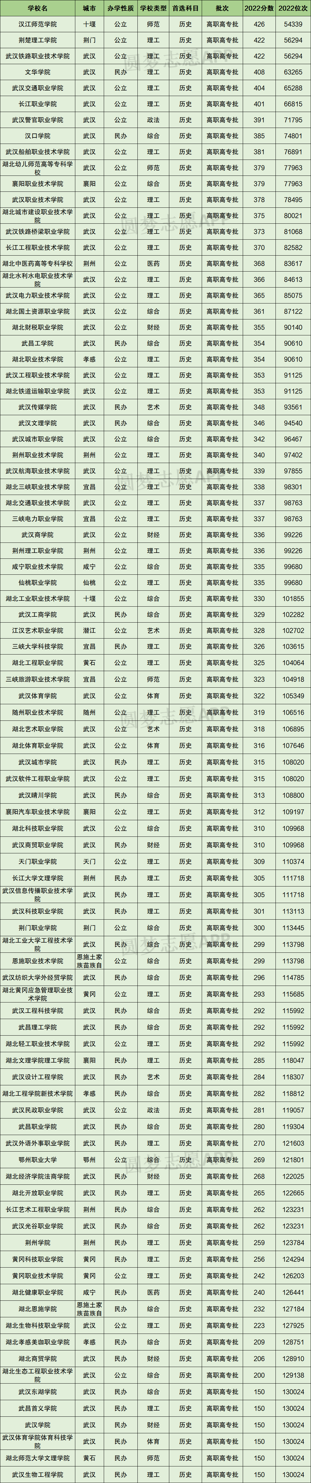 1、湖北省历史类分数最高的专科大学为汉江师范学院,录取分数线为426分,录取位次为54339;其次为荆楚理工学院、武汉铁路职业技术学院,最低分数为422分,对应全省最低位次为56294。