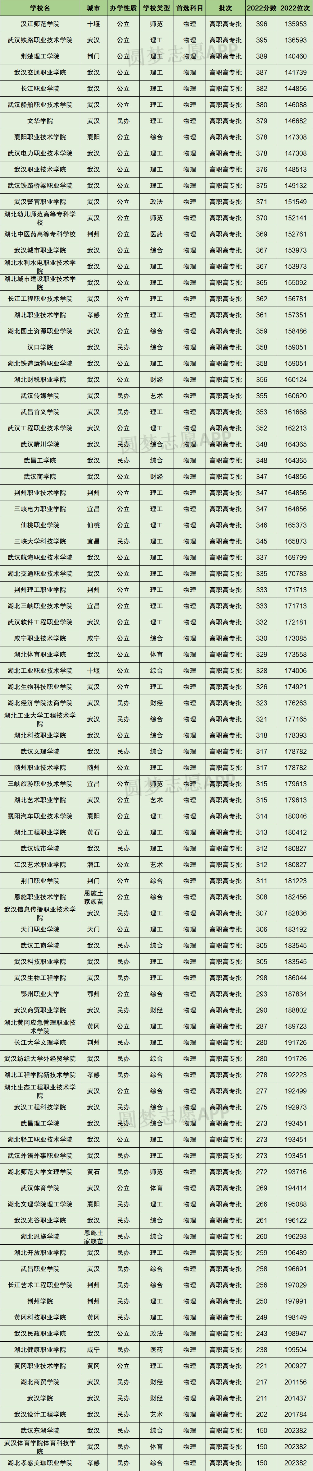 1、湖北省物理类分数最高的专科大学为汉江师范学院,录取分数线为396分,录取位次为135953;其次为武汉铁路职业技术学院,最低分数为395分,对应全省最低位次为136593。