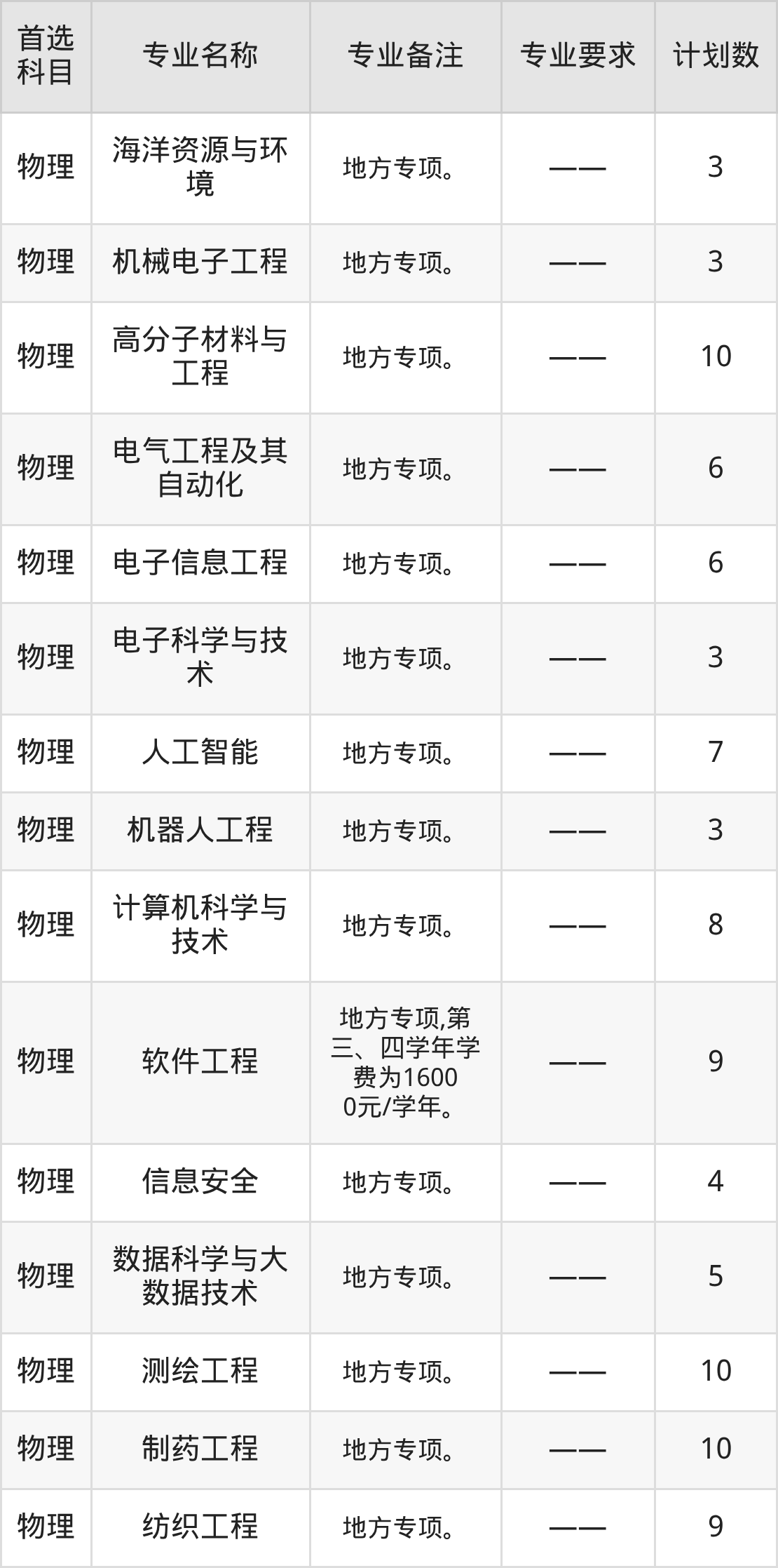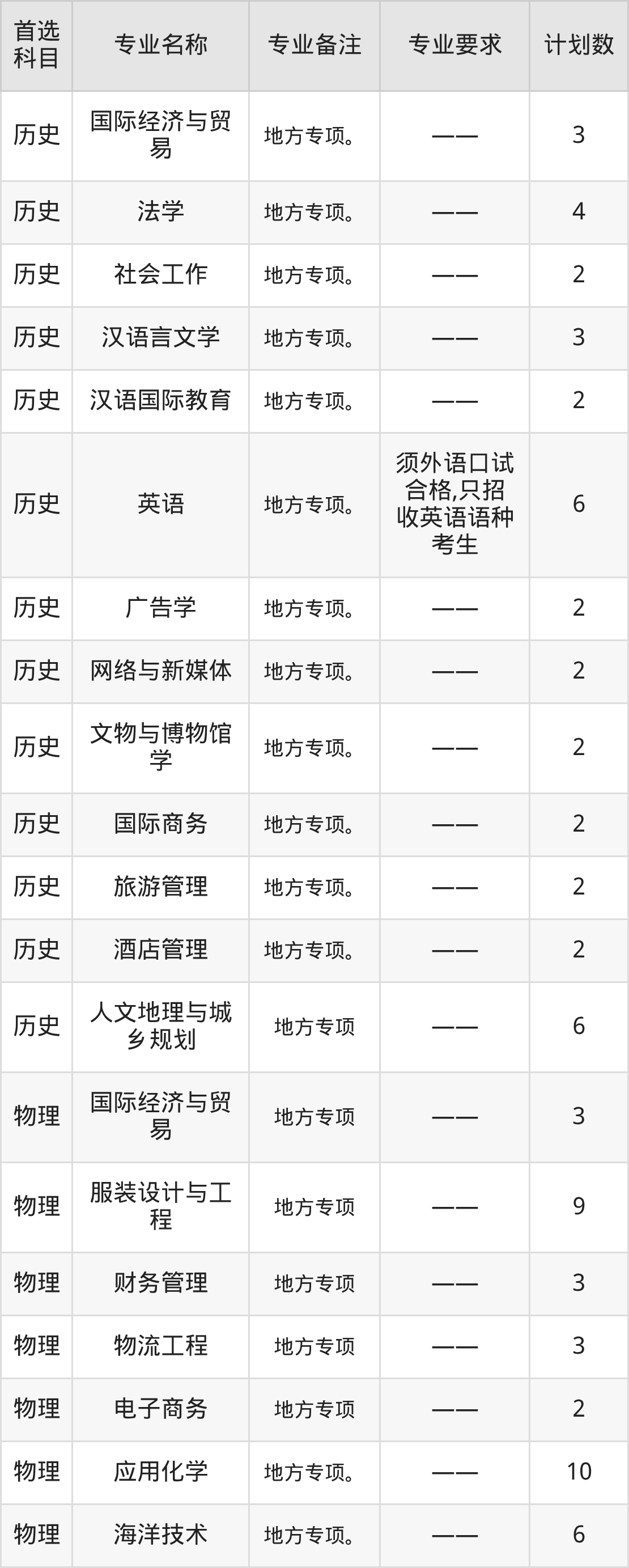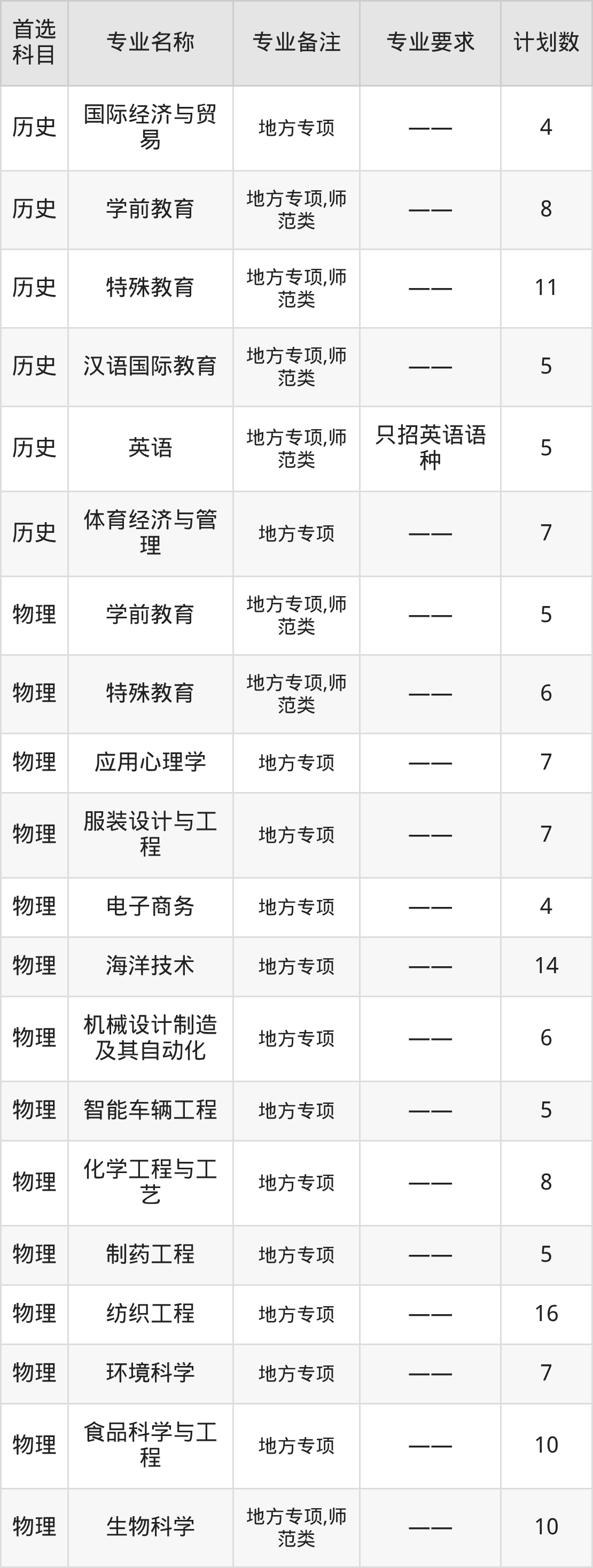 2025年泉州师范学院在福建招生人数是150人,招生专业包括国际经济与贸易、学前教育、特殊教育、汉语国际教育、英语、体育经济与管理、应用心理学、服装设计与工程、电子商务、海洋技术等。具体如下图所示: