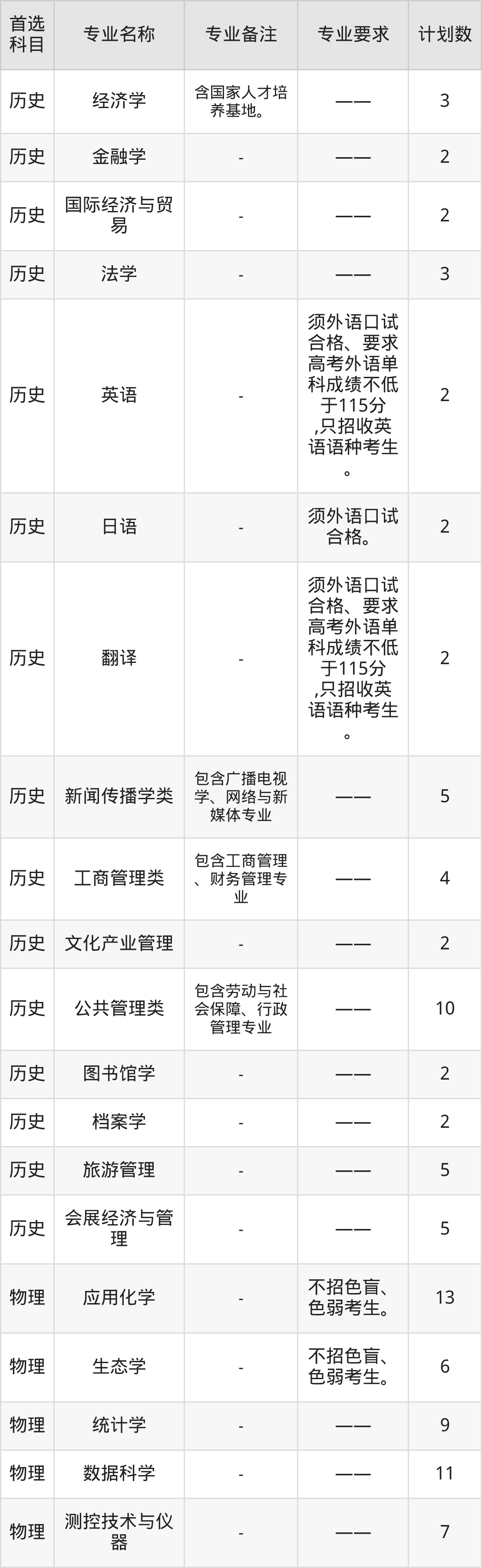 2025年福建师范大学在福建招生人数是300人,招生专业包括经济学、金融学、国际经济与贸易、法学、英语、日语、翻译、新闻传播学类、工商管理类、文化产业管理等。具体如下图所示: