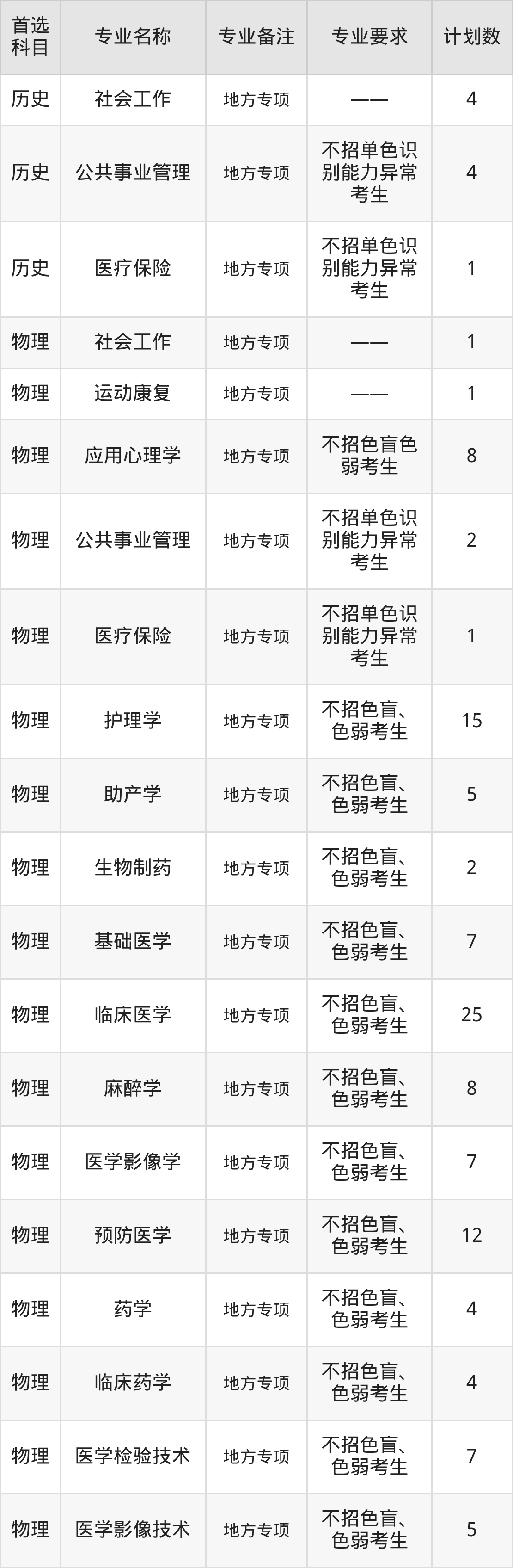 2025年福建医科大学在福建招生人数是141人,招生专业包括社会工作、公共事业管理、医疗保险、运动康复、应用心理学、护理学、助产学、生物制药、基础医学、临床医学等。具体如下图所示: