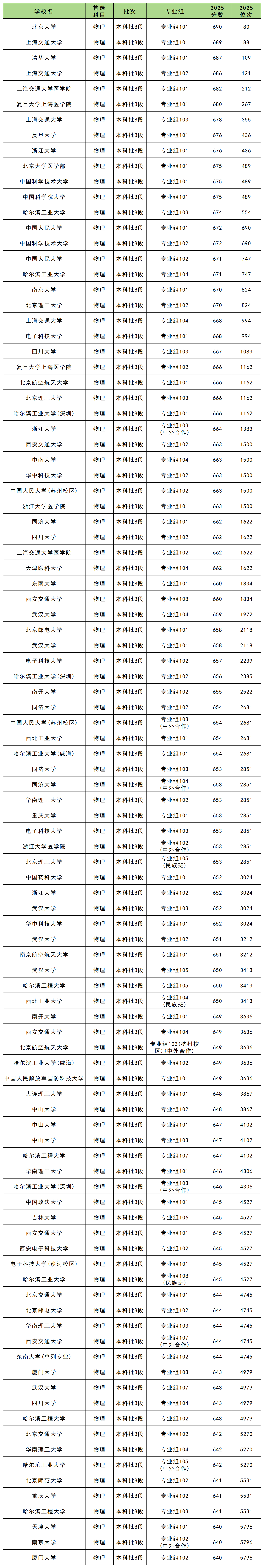 如下为各位展示的是2025年四川物理组本科院校的Top100录取分及位次情况:
