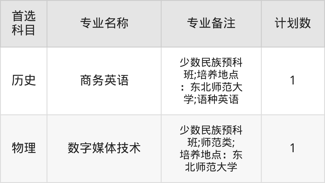 2025年东北师范大学在辽宁招生人数是2人,招生专业包括商务英语、数字媒体技术。具体如下图所示: