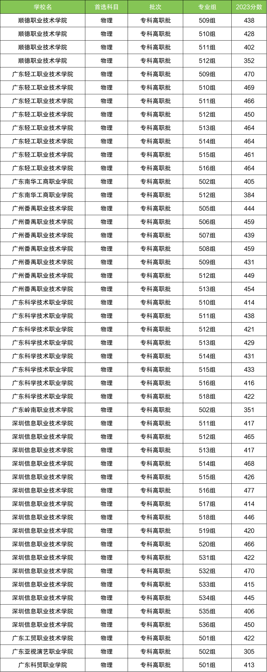 数据显示,这些院校在广东的物理类录取分数范围是305分~477分。其中深圳信息职业技术学院的招生分数普遍较高,招生专业组也比较多,收分最高的专业组是516组(477分)。