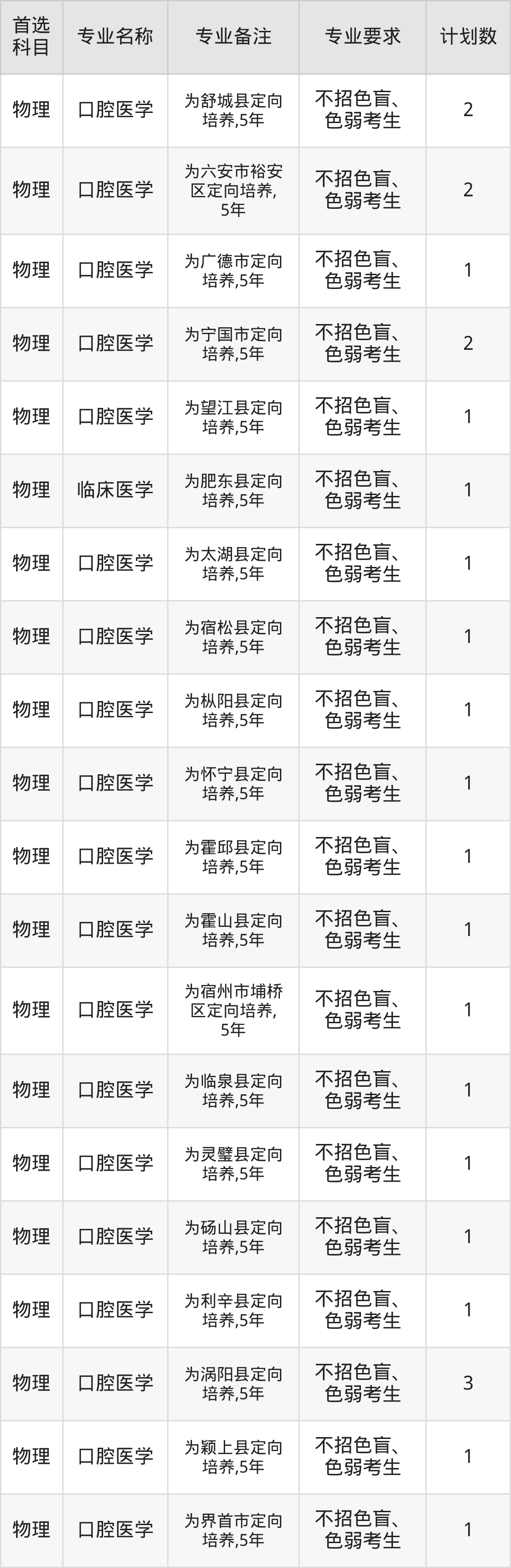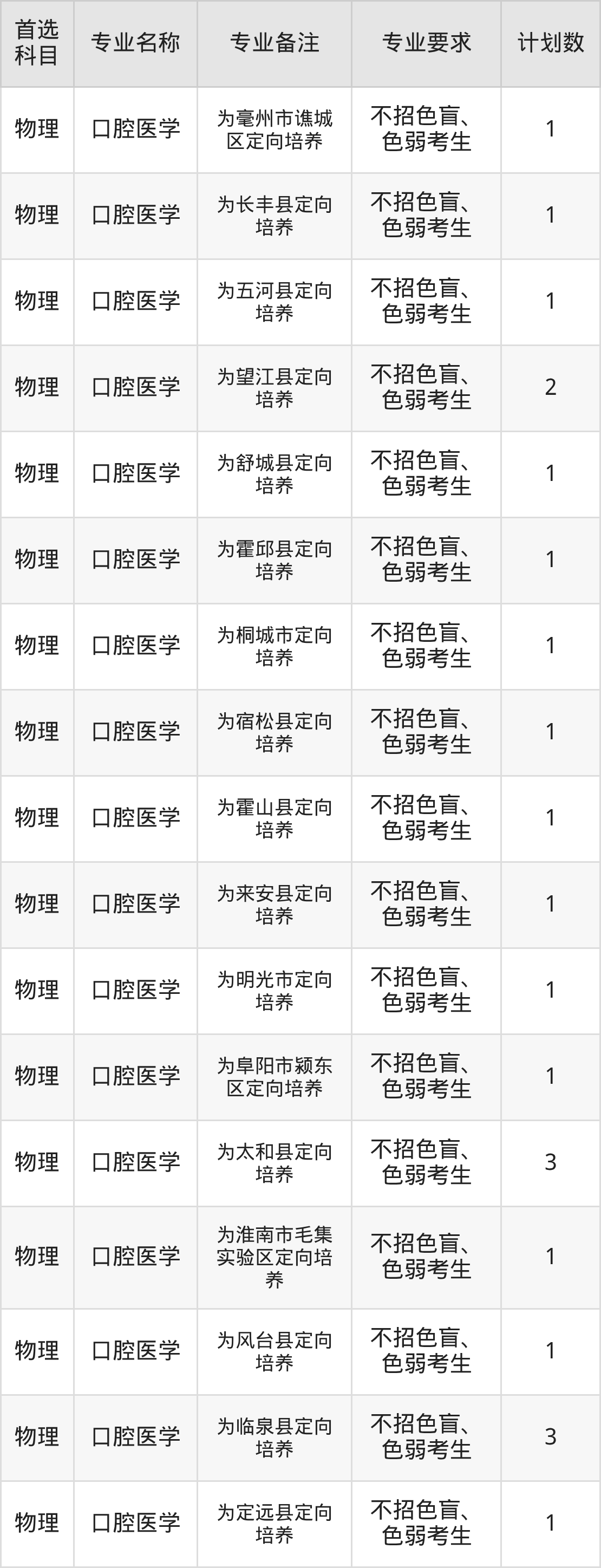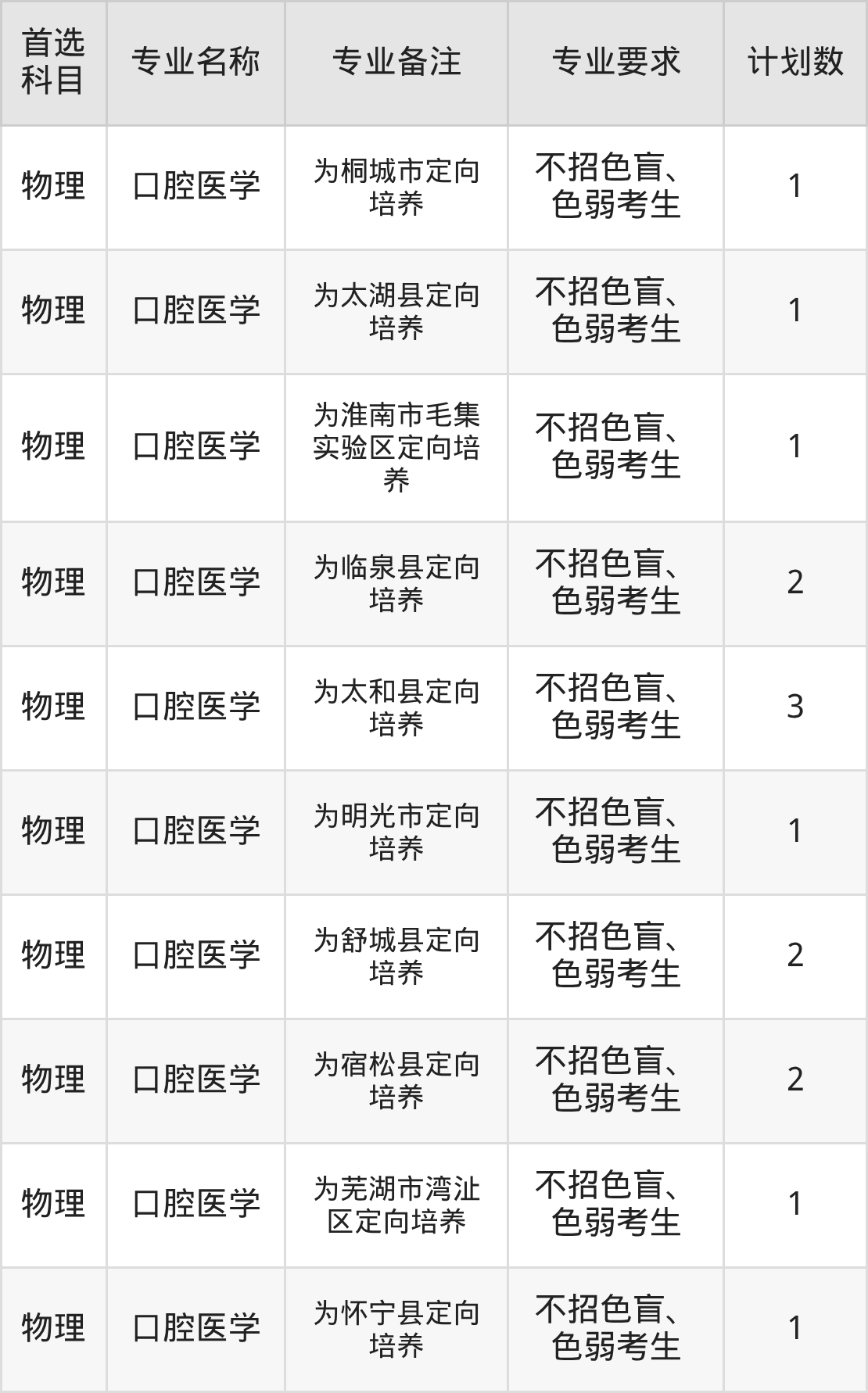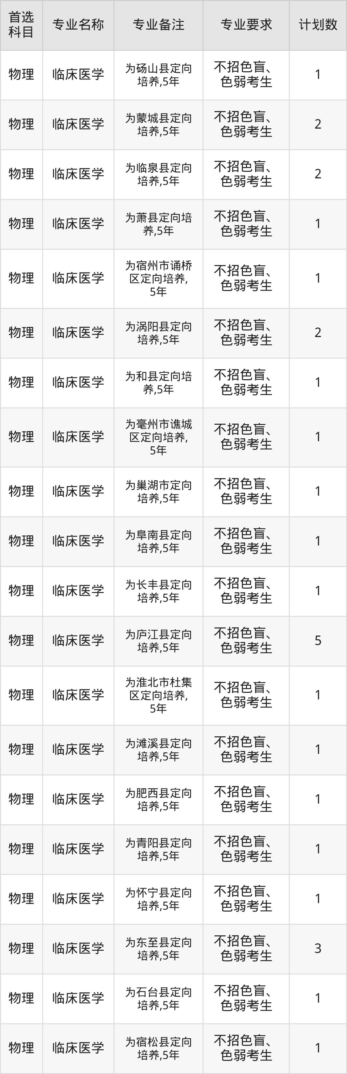 2025年安徽医科大学在安徽招生人数是140人,招生专业包括临床医学、口腔医学。具体如下图所示:
