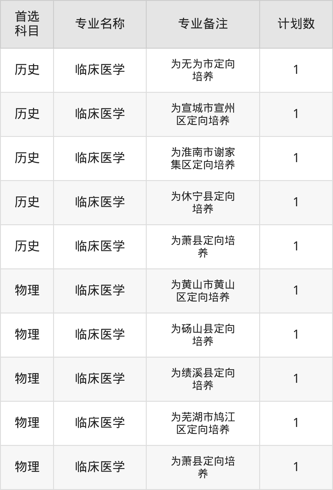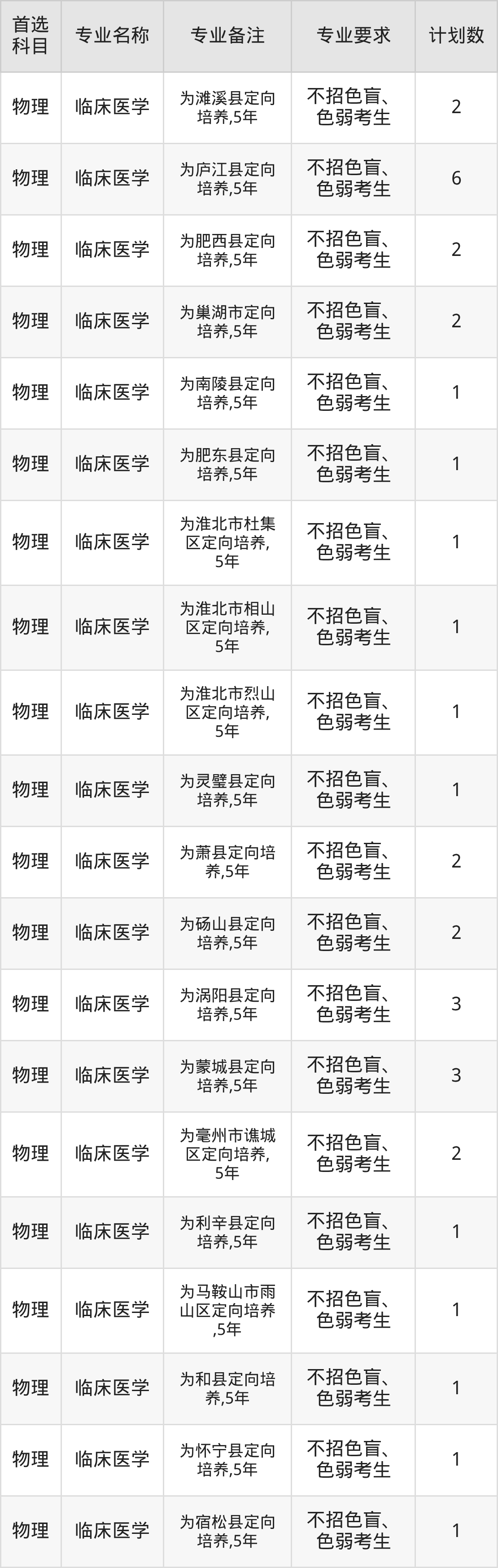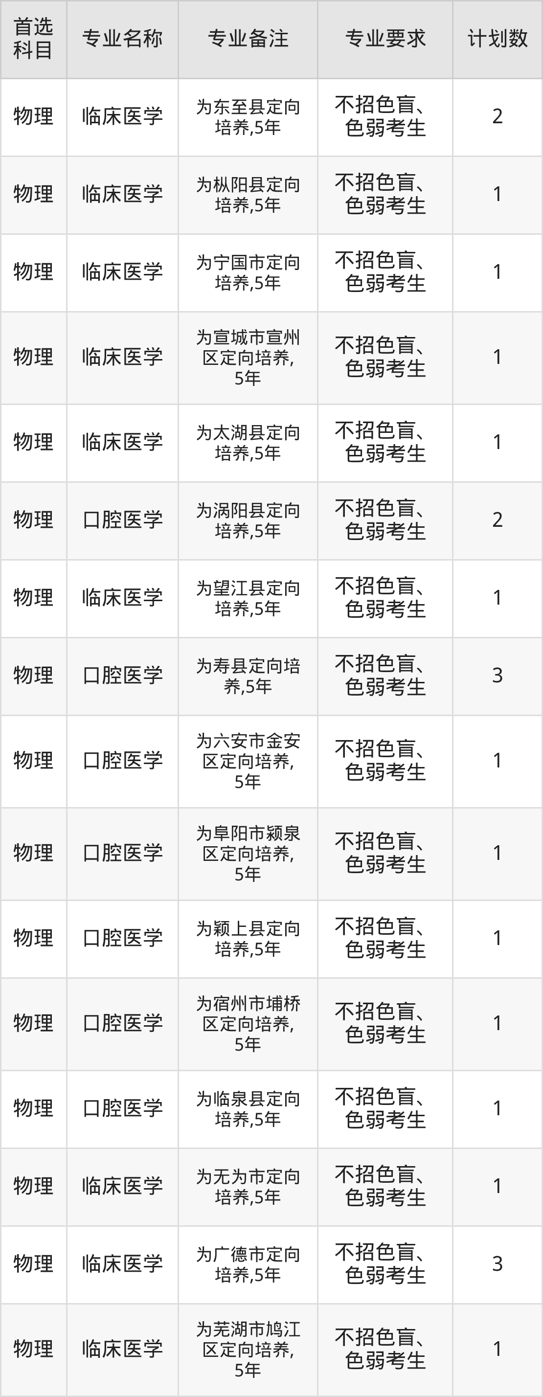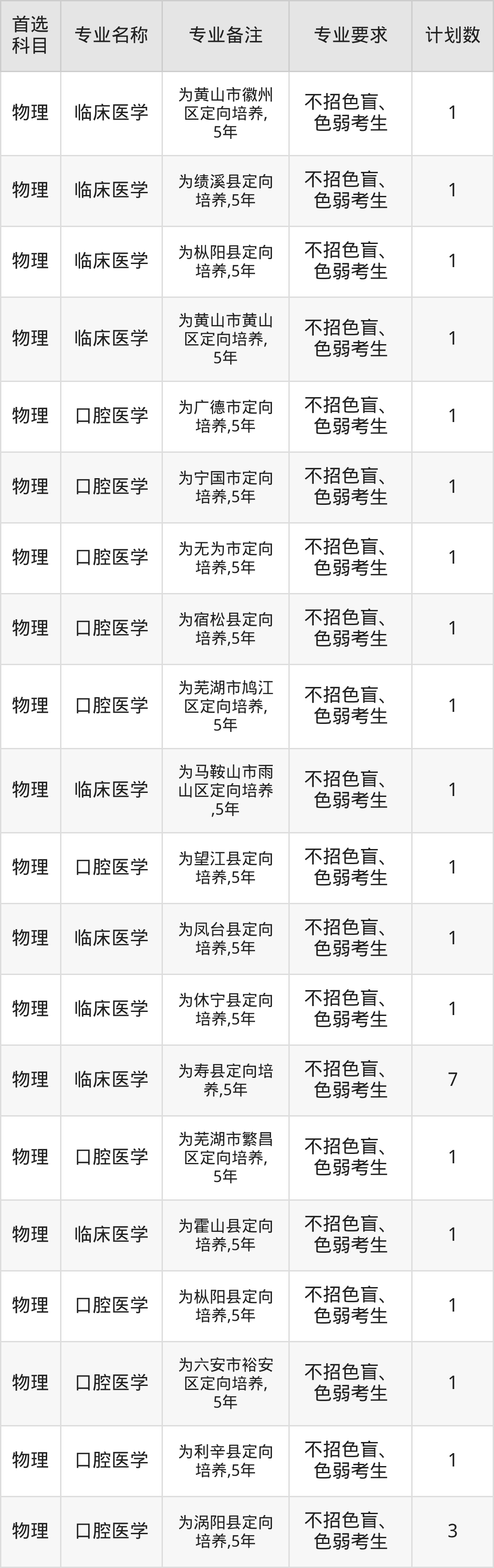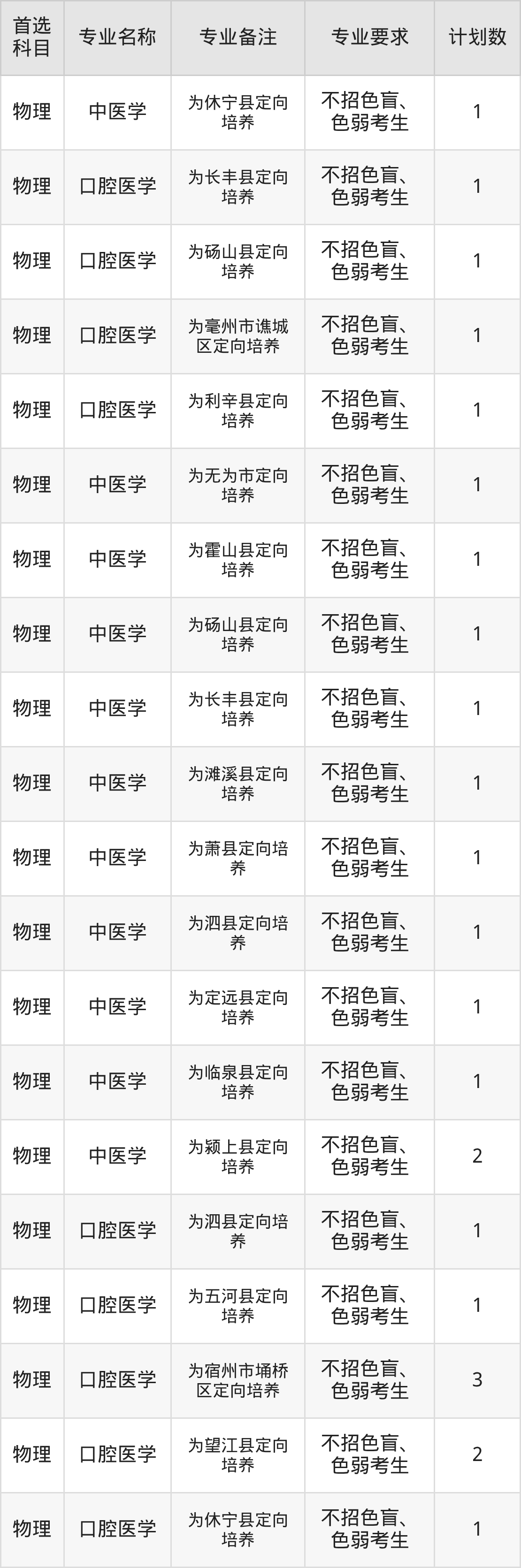 2025年安徽医科大学在安徽招生人数是140人,招生专业包括临床医学、口腔医学。具体如下图所示: