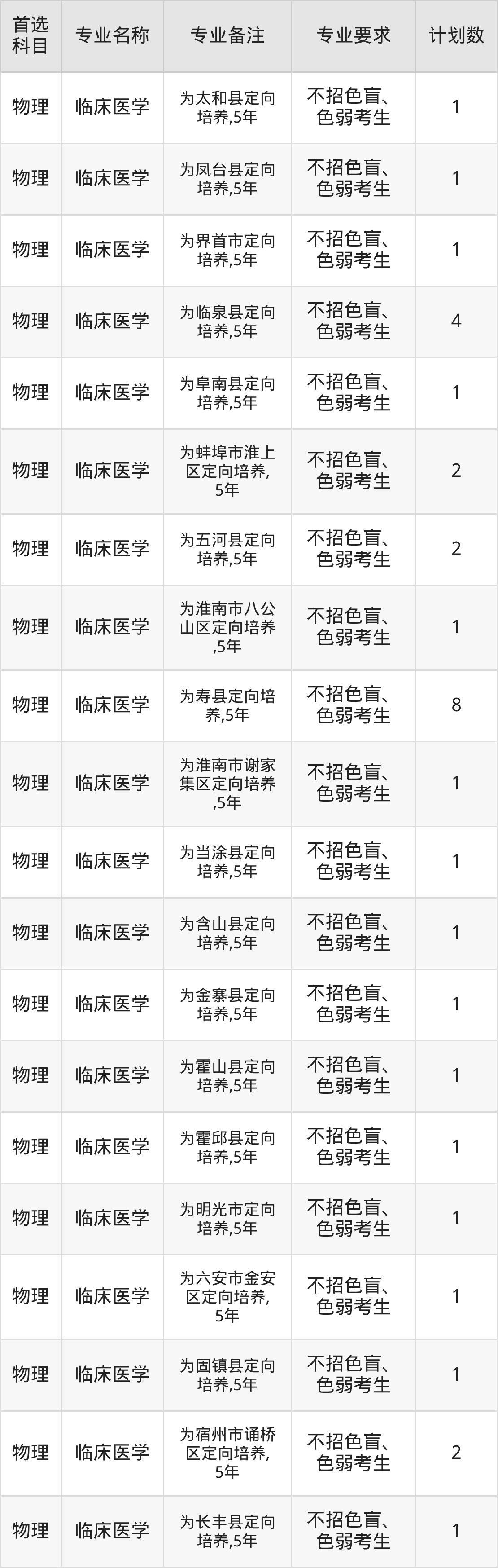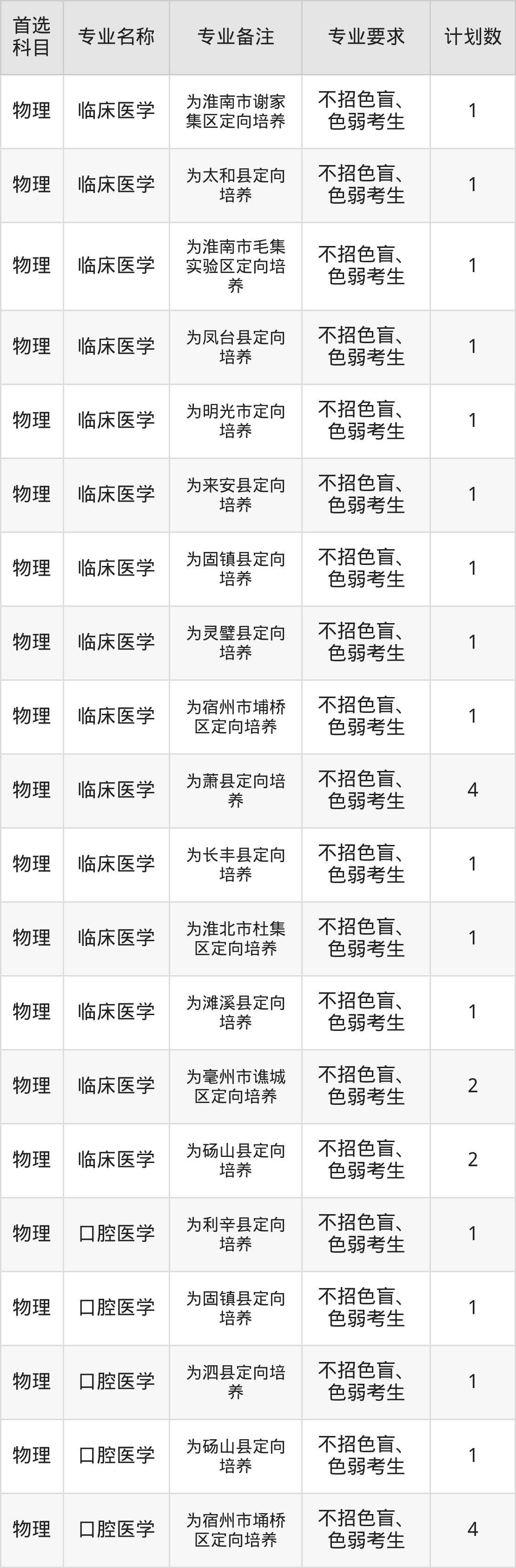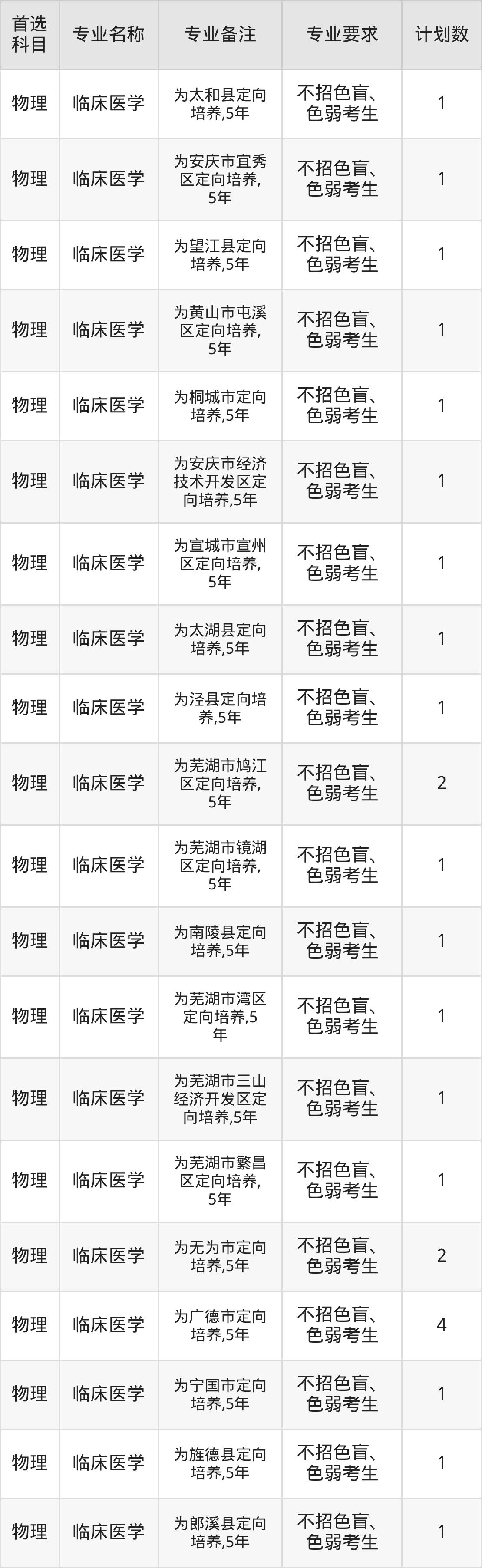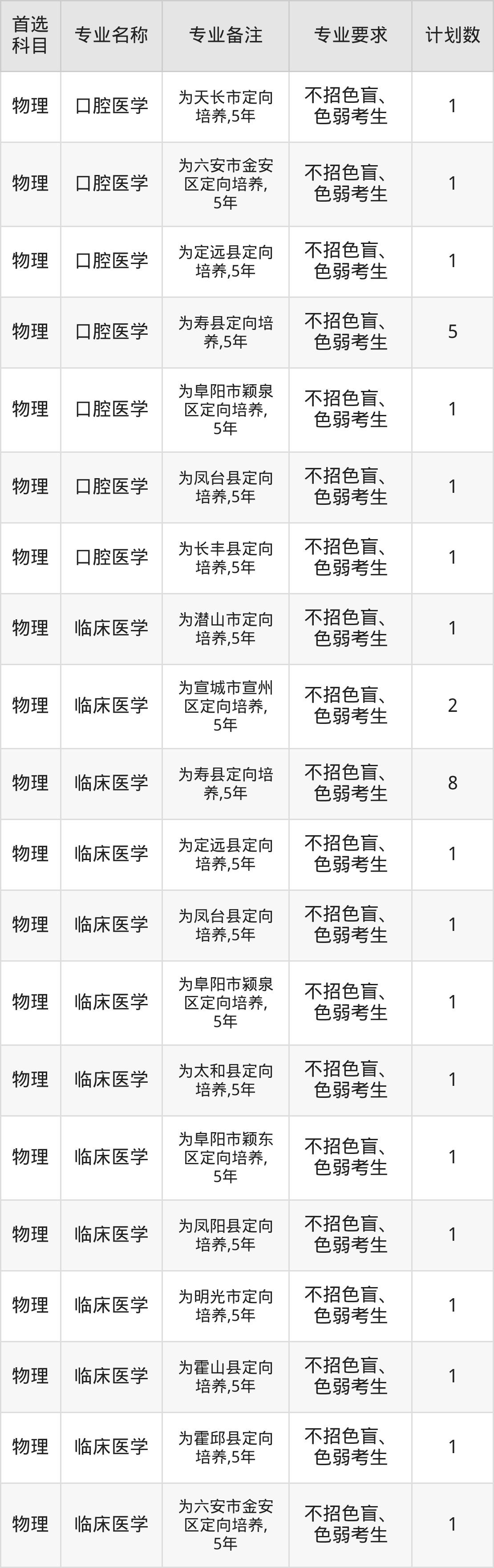 2025年安徽医科大学在安徽招生人数是140人,招生专业包括临床医学、口腔医学。具体如下图所示: