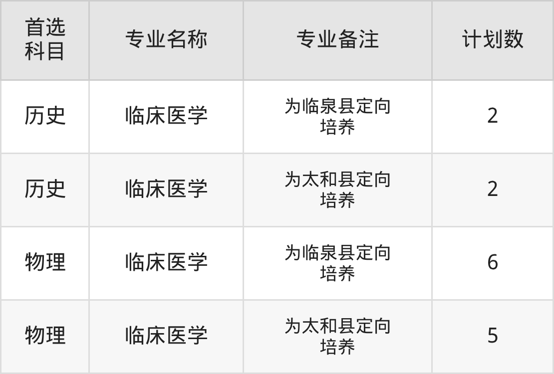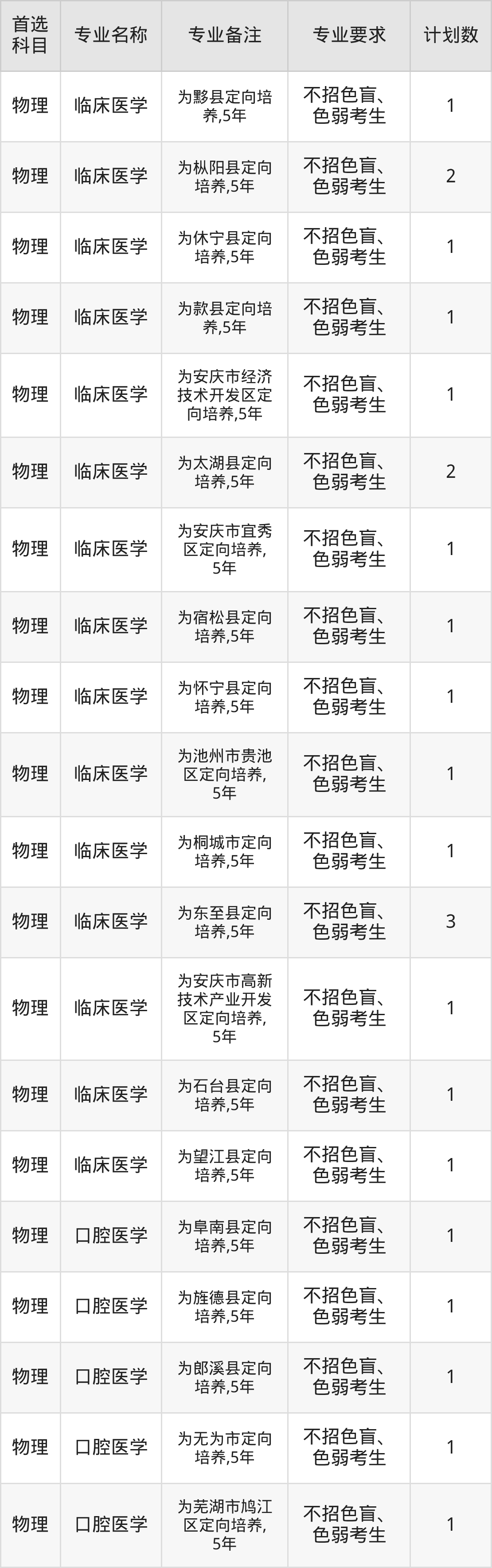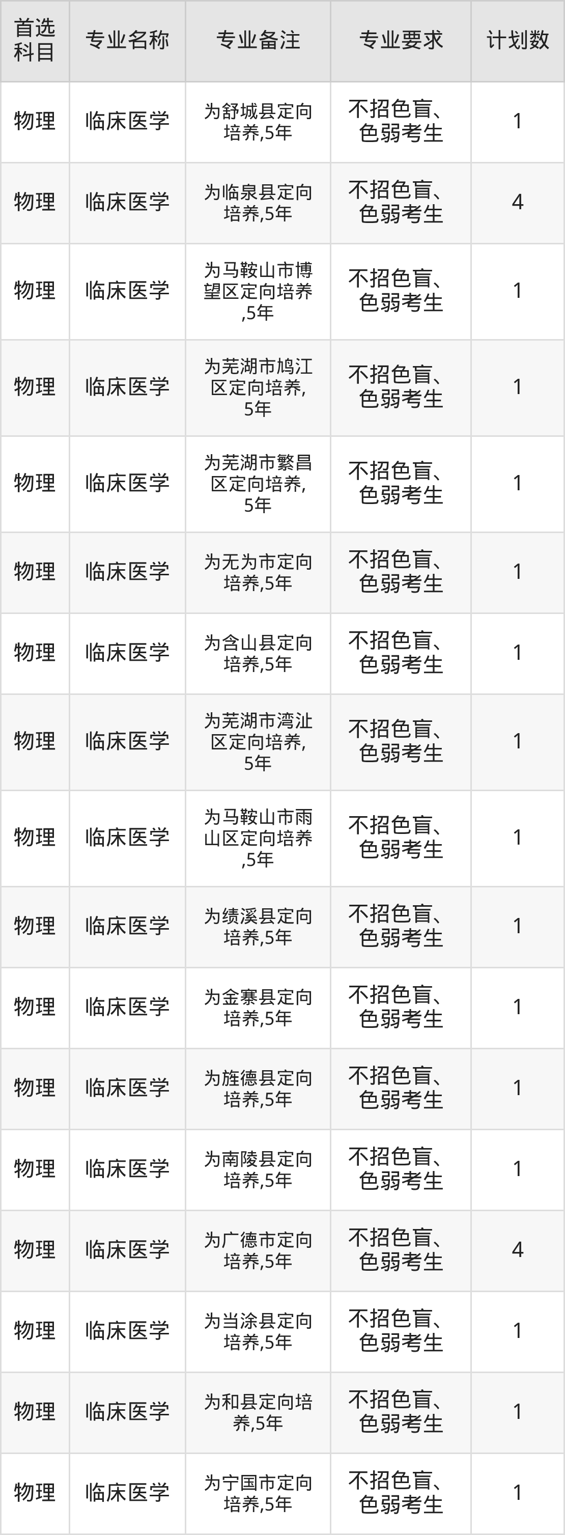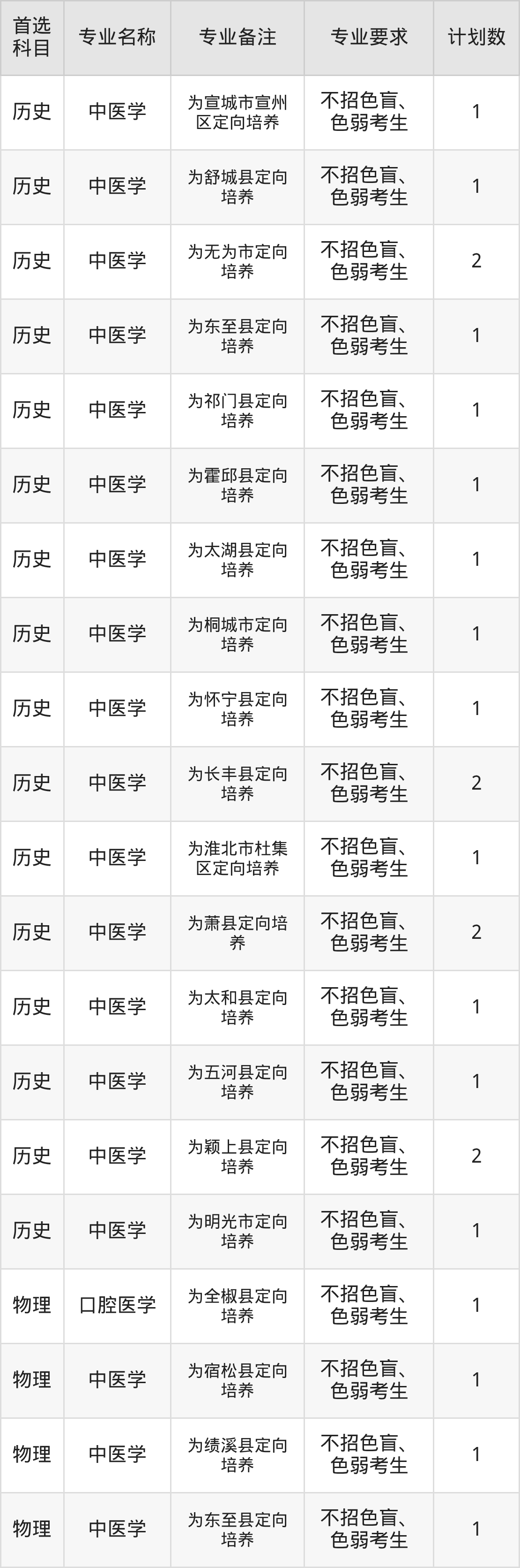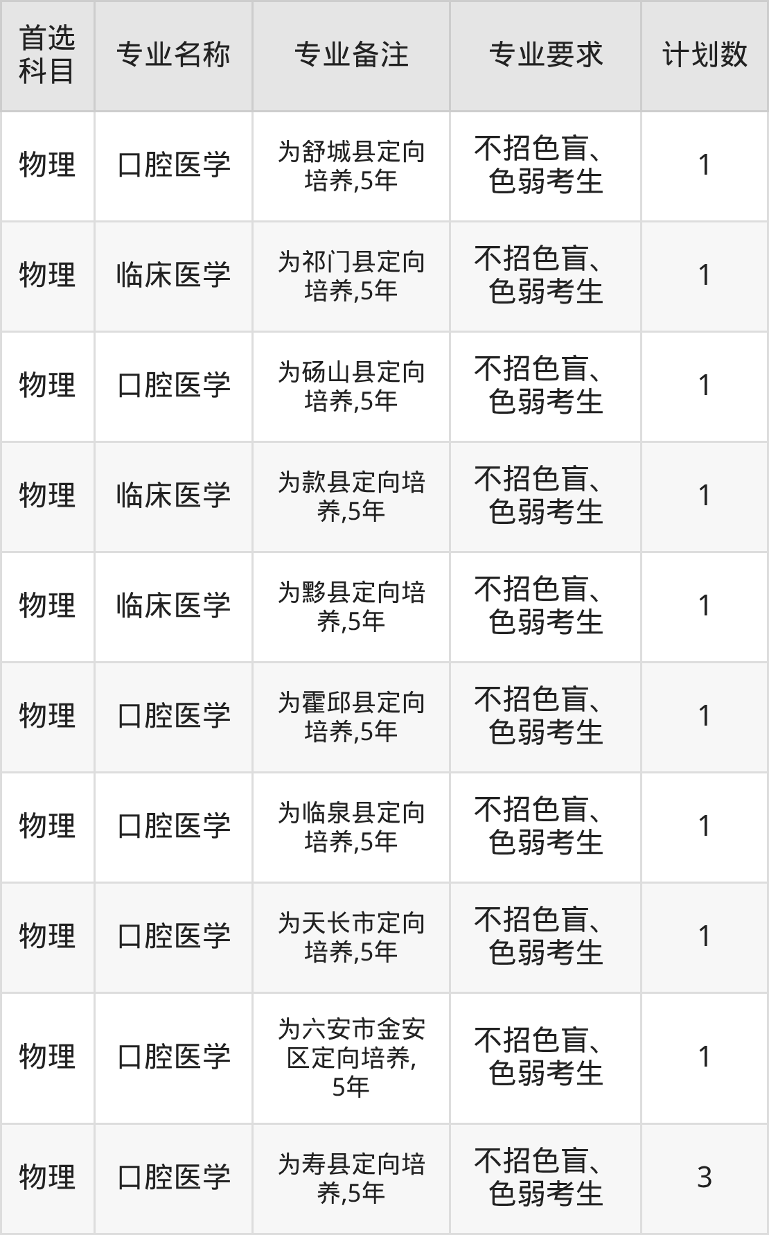 2025年安徽医科大学在安徽招生人数是140人,招生专业包括临床医学、口腔医学。具体如下图所示: