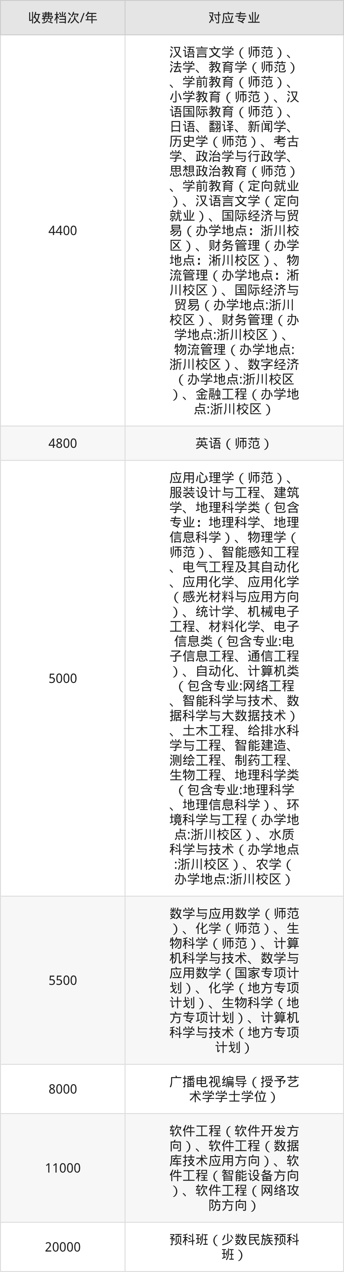 南阳师范学院学费一年在4400元-20000元之间,各专业收费档次有7个,分别为4400元/年、4800元/年、5000元/年、5500元/年、8000元/年、11000元/年、20000元/年。低学费专业包含汉语言文学、法学、教育学、学前教育、小学教育等,高学费专业包含预科班。