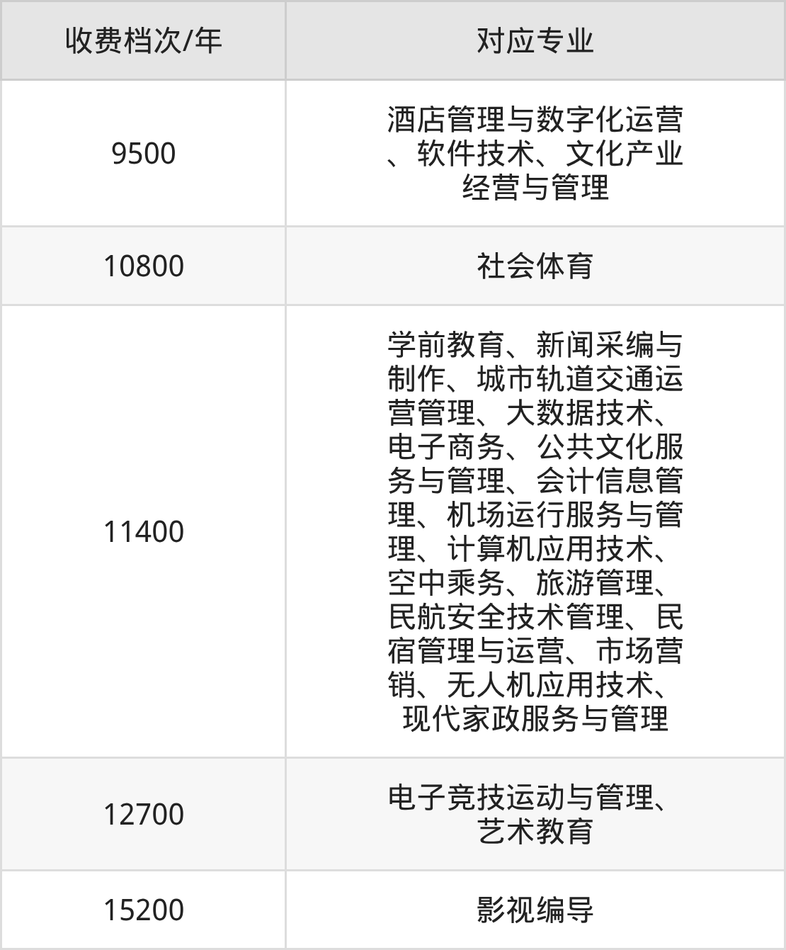 四川文化传媒职业学院学费标准分为5档,最高收费为15200元/年、最低收费为9500元/年。学费标准主要受专业类型和学制影响,以下详细列举: