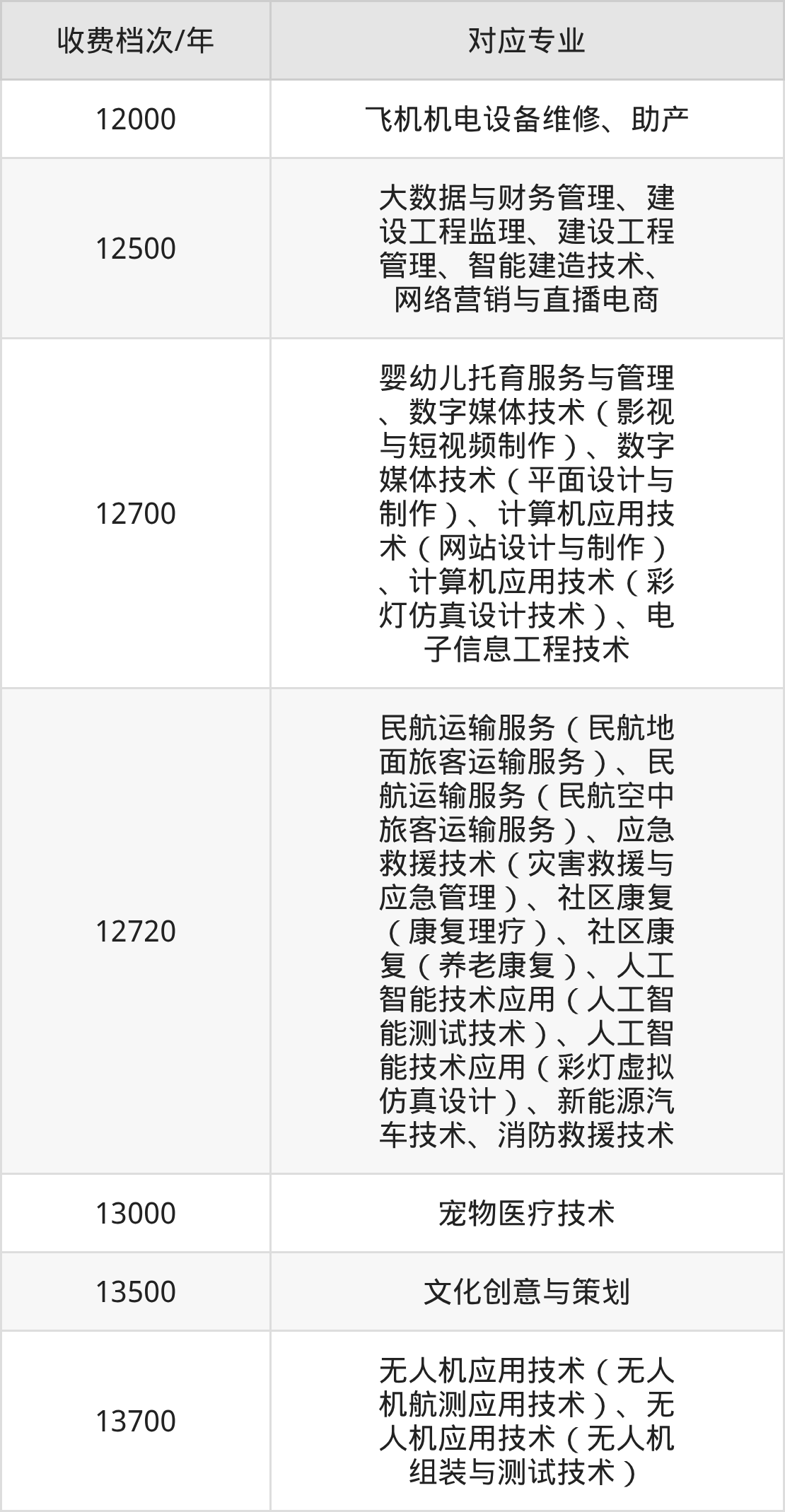 自贡职业技术学院学费标准分为7档,最高收费为13700元/年、最低收费为12000元/年。学费标准主要受专业类型和学制影响,以下详细列举: