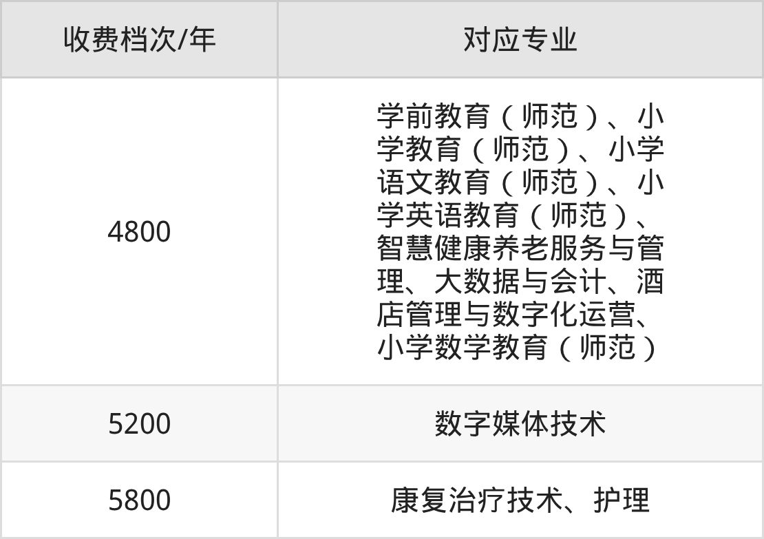 川北幼儿师范高等专科学校学费标准分为3档,最高收费为5800元/年、最低收费为4800元/年。学费标准主要受专业类型和学制影响,以下详细列举: