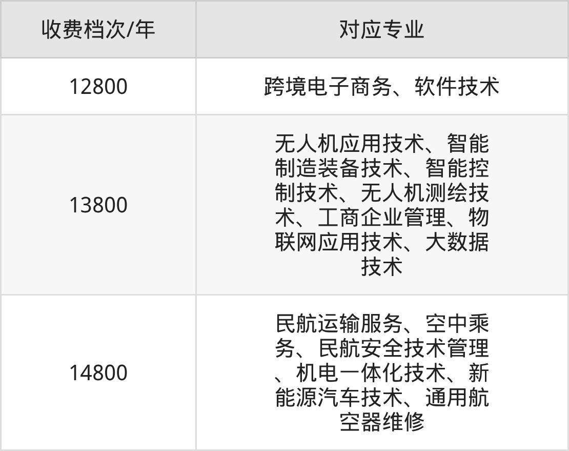 芜湖航空职业学院学费标准分为3档,最高收费为14800元/年、最低收费为12800元/年。学费标准主要受专业类型和学制影响,以下详细列举: