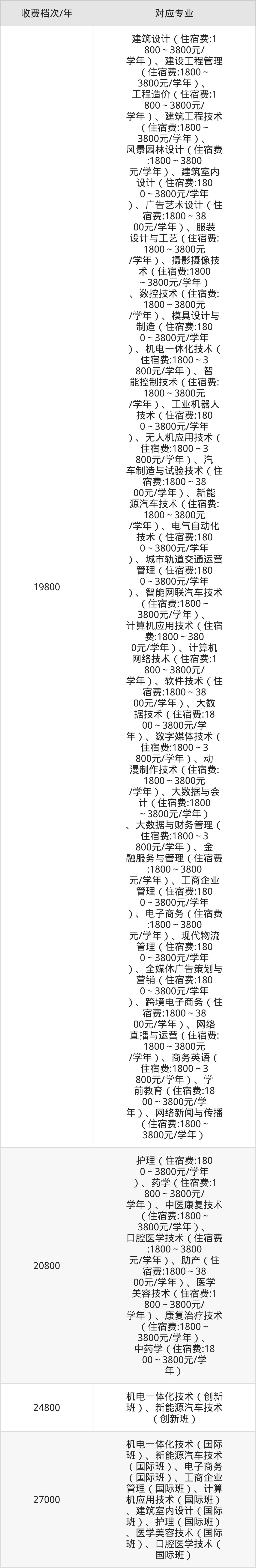广州南洋理工职业学院学费标准分为4档,最高收费为27000元/年、最低收费为19800元/年。学费标准主要受专业类型和学制影响,以下详细列举: