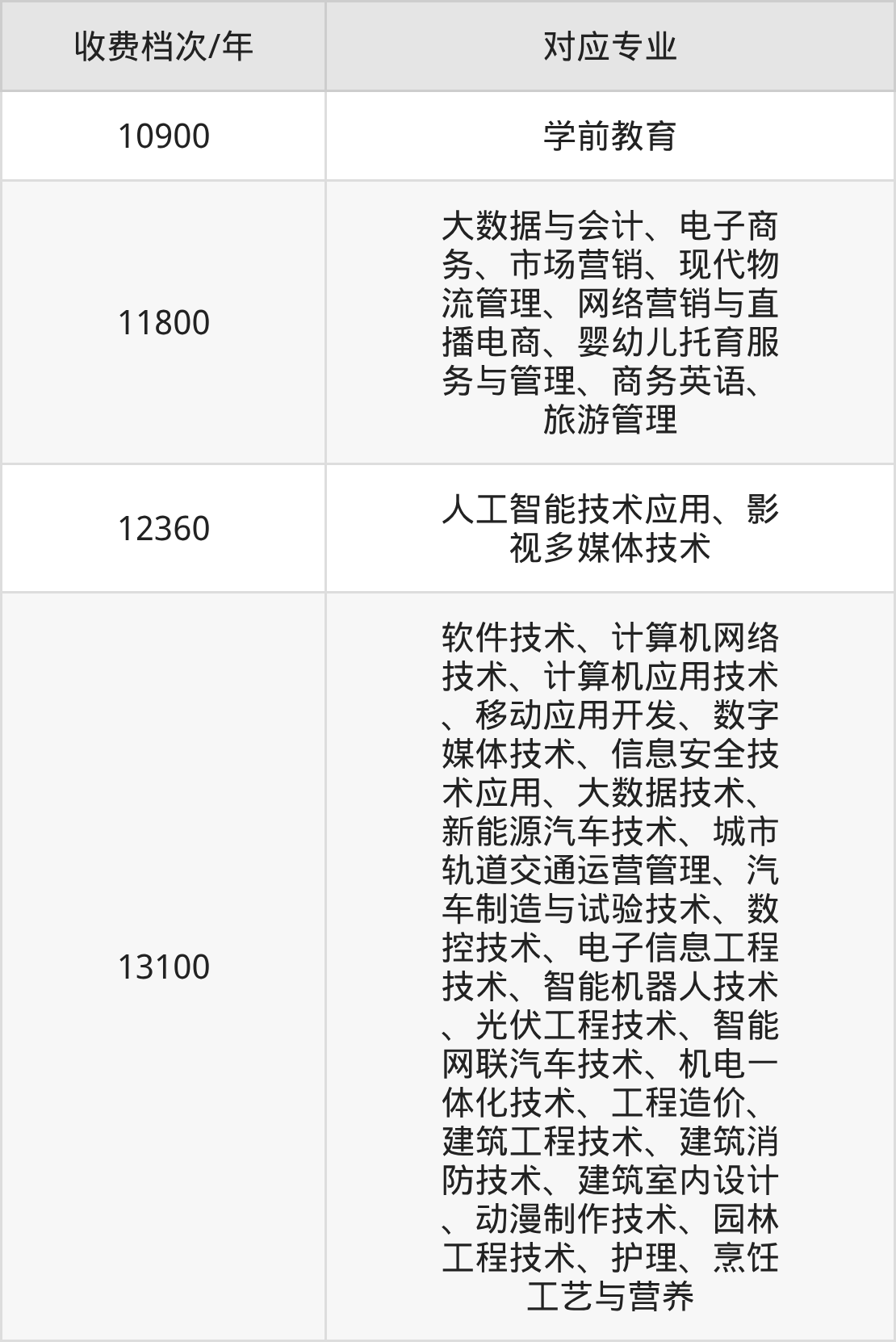 四川托普信息技术职业学院学费标准分为4档,最高收费为13100元/年、最低收费为10900元/年。学费标准主要受专业类型和学制影响,以下详细列举: