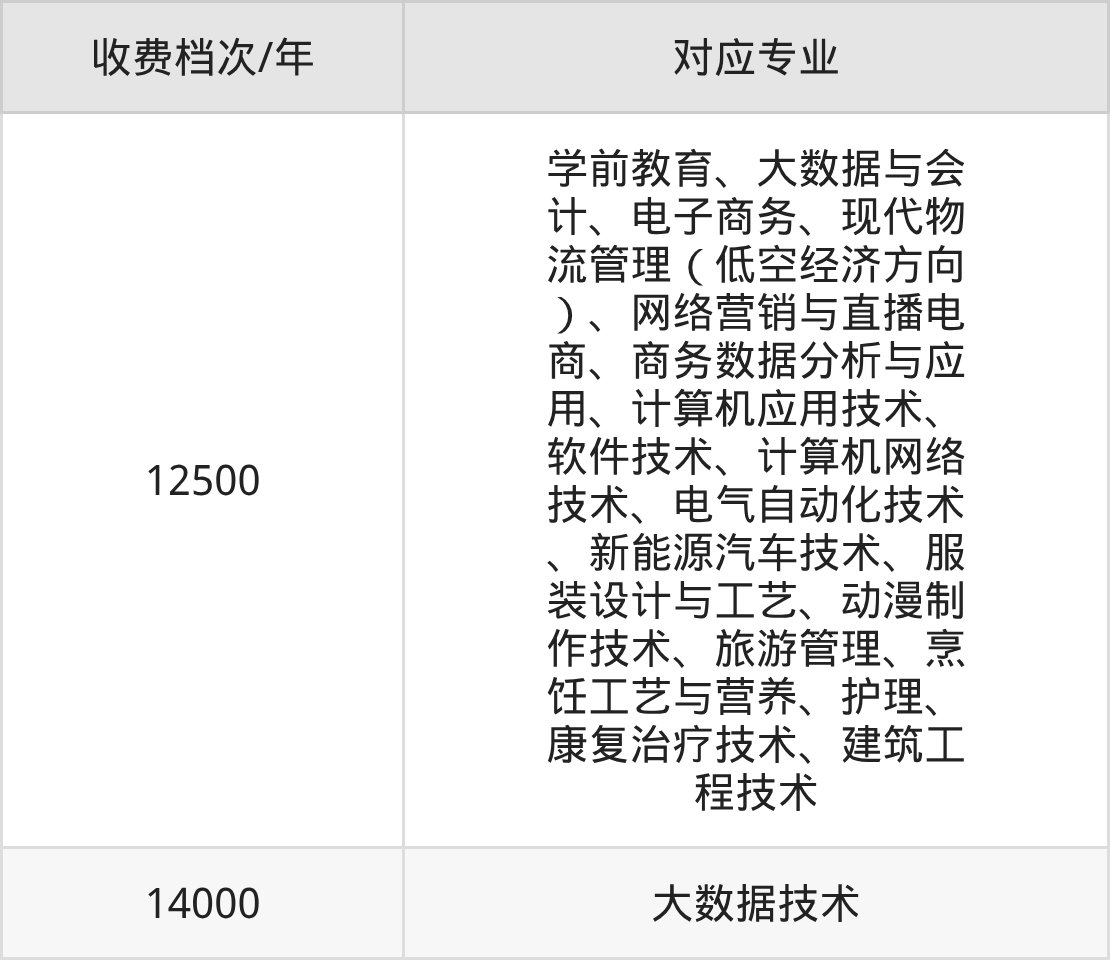 四川华新现代职业学院学费收费标准第二档:14000元/年,该学费标准对应专业为大数据技术,学制为3年。