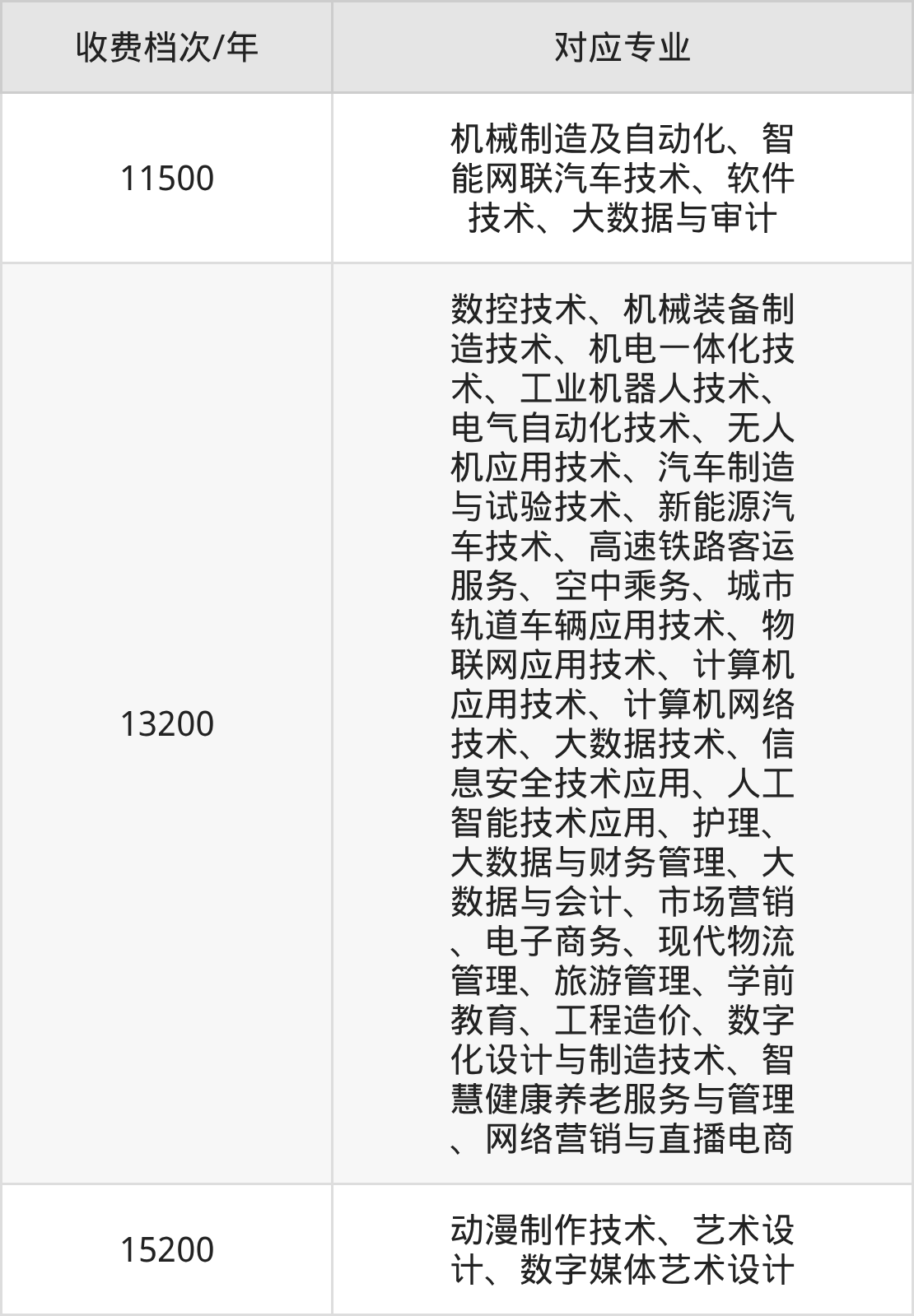 安徽扬子职业技术学院学费标准分为3档,最高收费为15200元/年、最低收费为11500元/年。学费标准主要受专业类型和学制影响,以下详细列举: