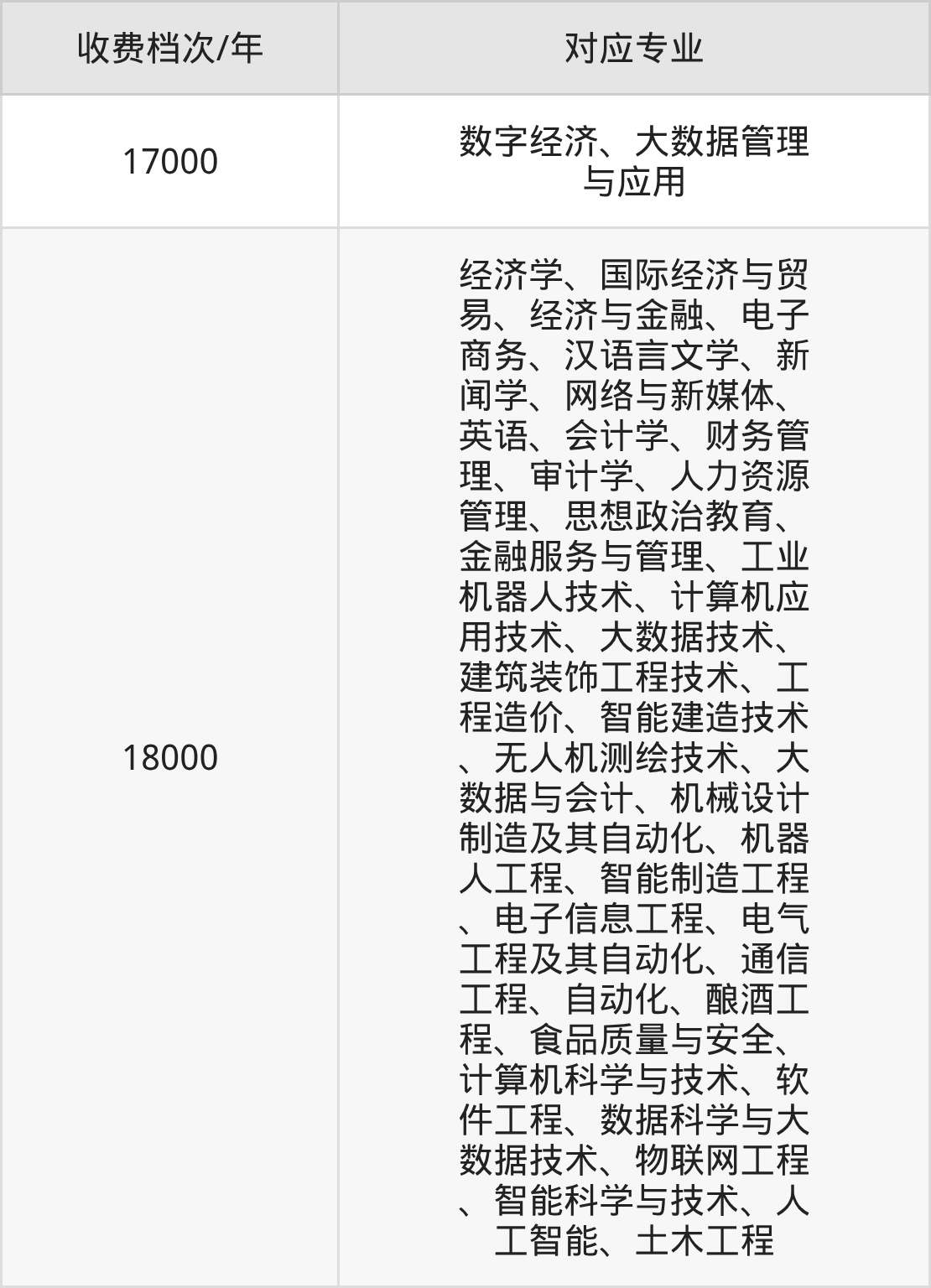 四川大学锦江学院学费标准分为2档,最高收费为18000元/年、最低收费为17000元/年。学费标准主要受专业类型和学制影响,以下详细列举: