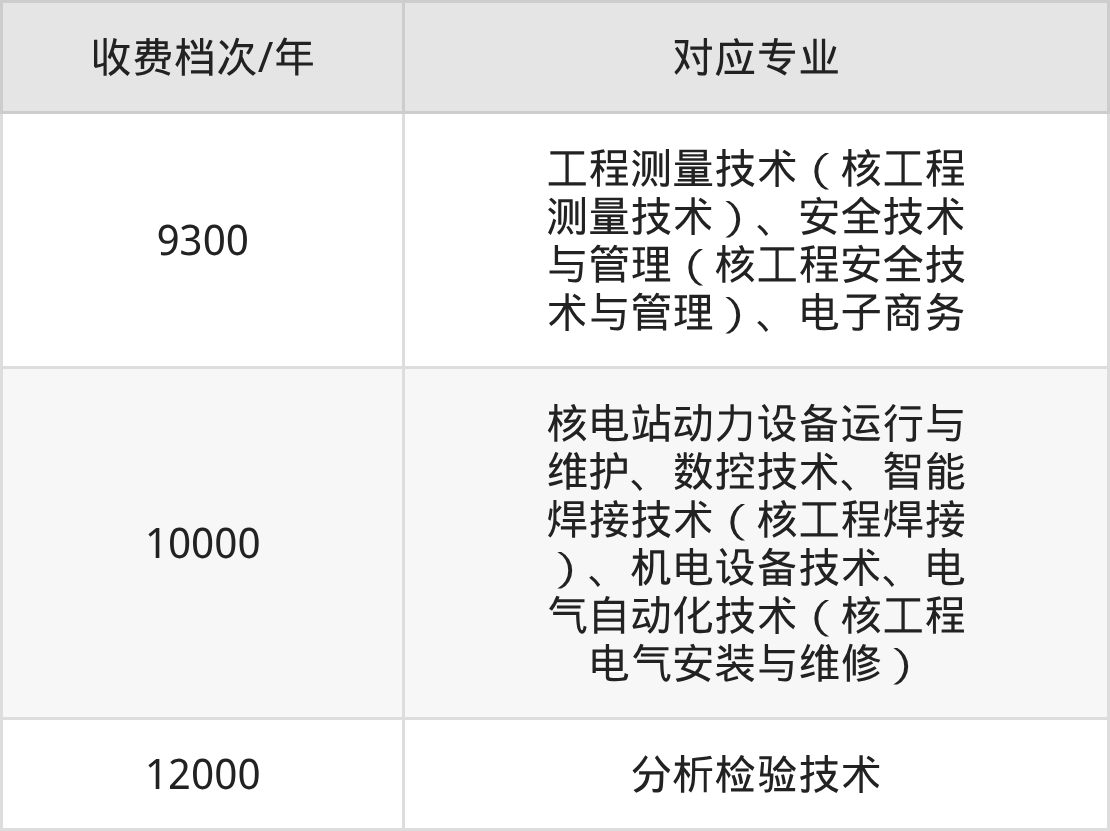 广元中核职业技术学院学费收费标准第二档:10000元/年,该学费标准对应专业为核电站动力设备运行与维护、数控技术、智能焊接技术(核工程焊接)、机电设备技术、电气自动化技术(核工程电气安装与维修),学制为3年。