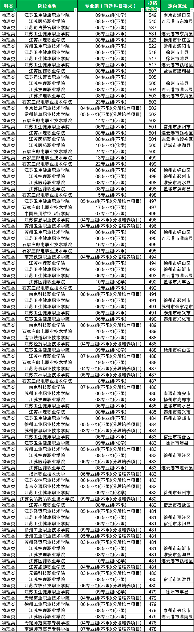 2025年全国大学在江苏物理类专科招生分数位于220分到549分之间不等,压专科线录取的院校共计207所,对应招生专业组有227个,包含:江苏卫生健康职业学院(10组)、江苏建筑职业技术学院(02组)、江苏安全技术职业学院(04组)、江苏城乡建设职业学院(04组)等,这些院校专业组的最低分均为220分,适合低分捡漏。