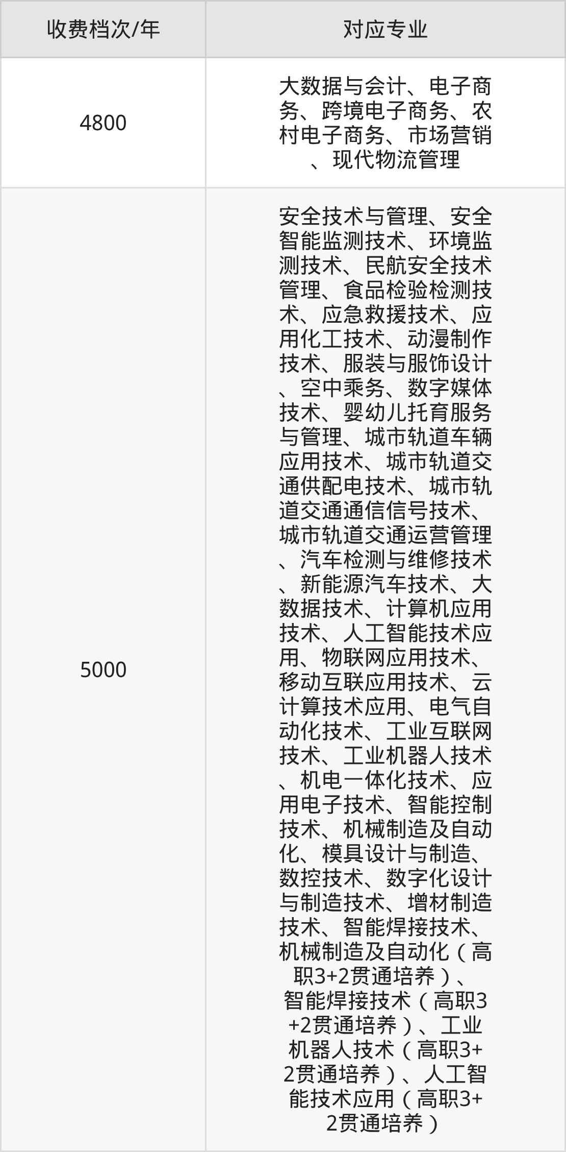 烟台工程职业技术学院学费标准分为2档,最高收费为5000元/年、最低收费为4800元/年。学费标准主要受专业类型和学制影响,以下详细列举: