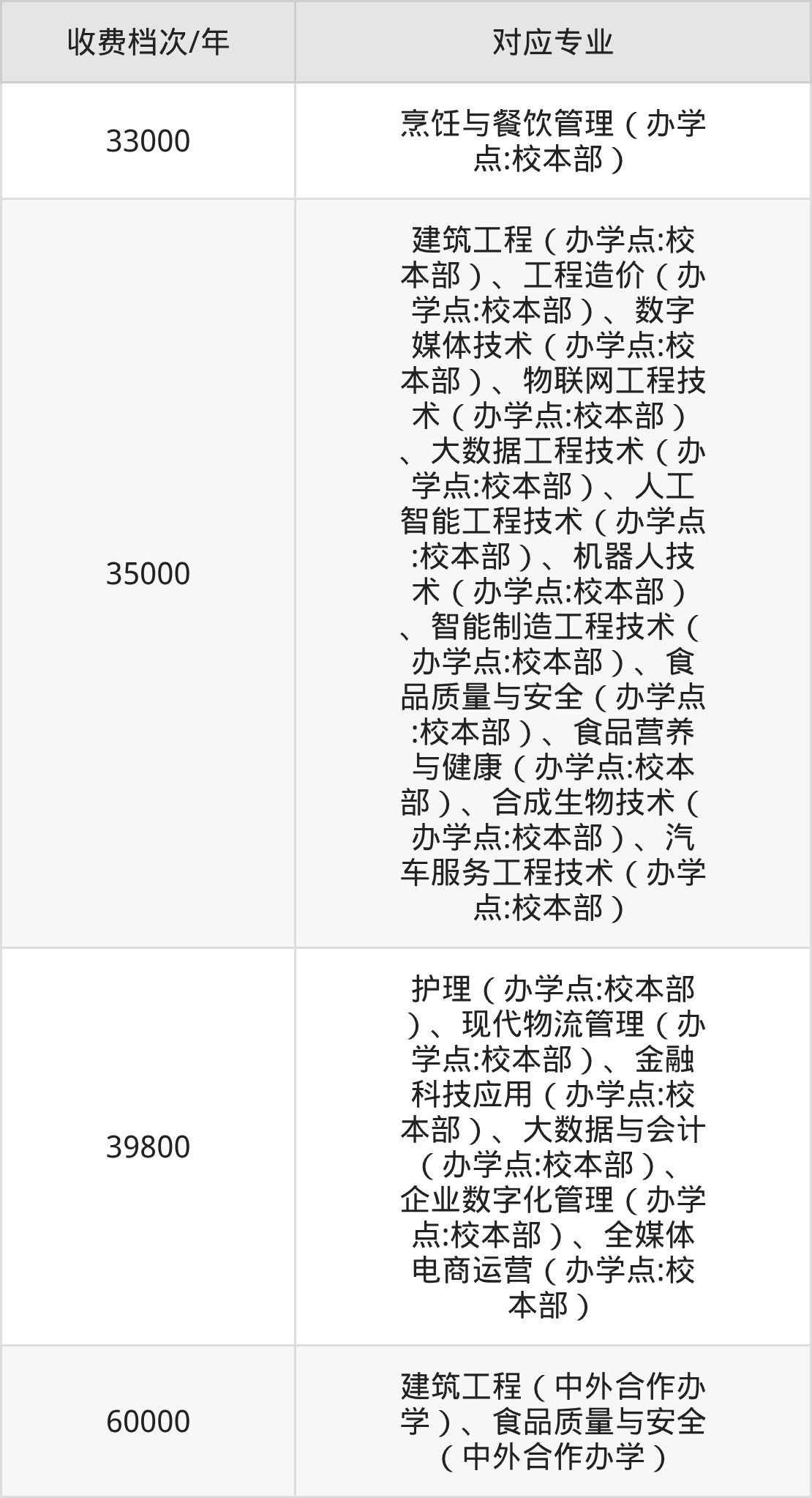 上海中侨职业技术大学学费标准分为4档,最高收费为60000元/年、最低收费为33000元/年。学费标准主要受专业类型和学制影响,以下详细列举: