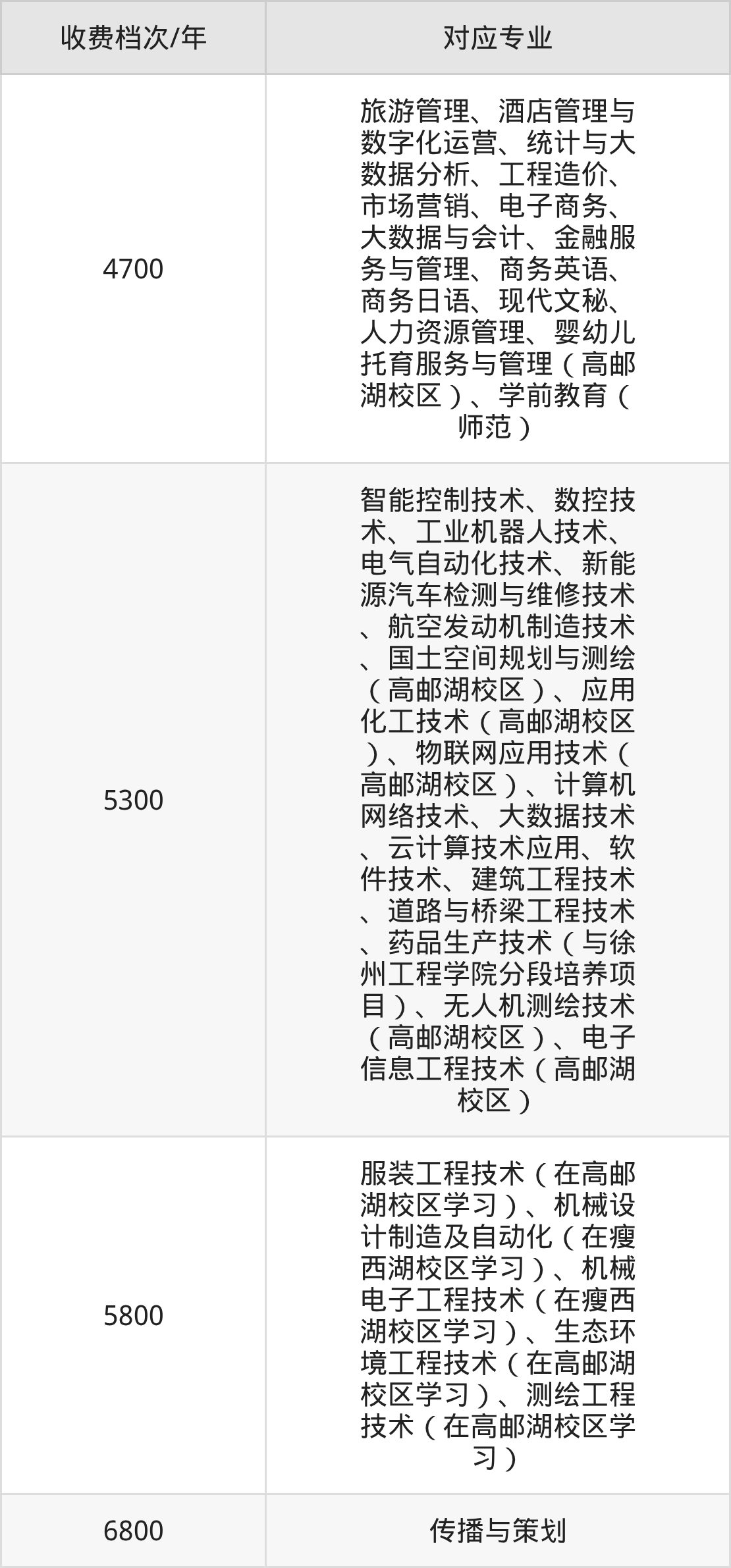 扬州职业技术大学学费标准分为4档,最高收费为6800元/年、最低收费为4700元/年。学费标准主要受专业类型和学制影响,以下详细列举: