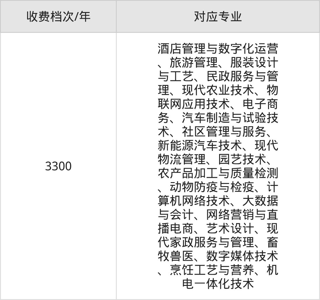 和田职业技术学院学费标准只有1档,最低收费为3300元/年。学费标准主要受专业类型和学制影响,以下详细列举: