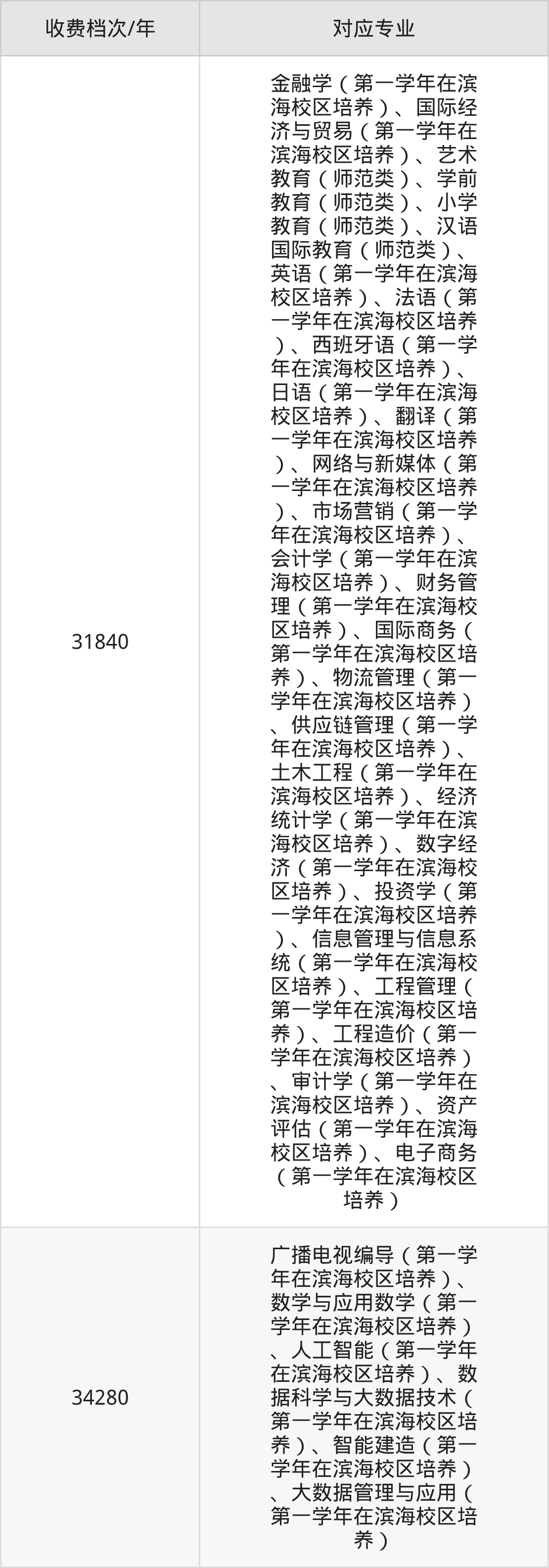 福州外语外贸学院学费收费标准第二档:34280元/年,该学费标准对应专业为广播电视编导(第一学年在滨海校区培养)、数学与应用数学(第一学年在滨海校区培养)、人工智能(第一学年在滨海校区培养)、数据科学与大数据技术(第一学年在滨海校区培养)、智能建造(第一学年在滨海校区培养)、大数据管理与应用(第一学年在滨海校区培养),学制为4年。