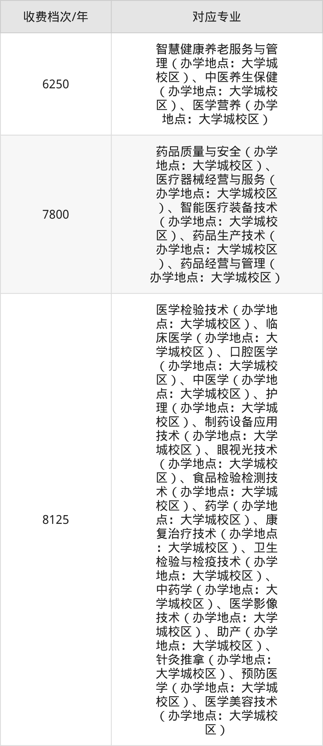 重庆医药高等专科学校学费标准分为3档,最高收费为8125元/年、最低收费为6250元/年。学费标准主要受专业类型和学制影响,以下详细列举: