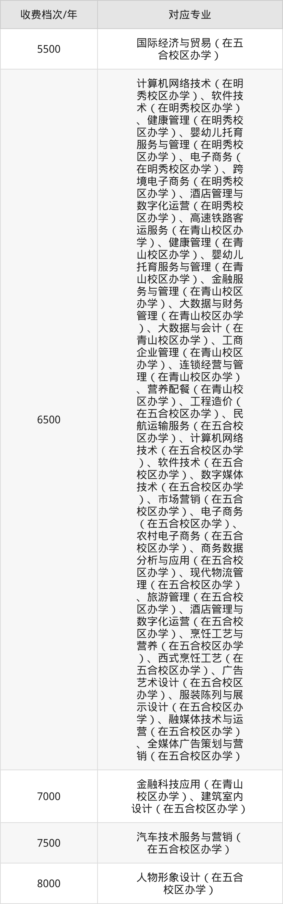 广西经贸职业技术学院学费标准分为5档,最高收费为8000元/年、最低收费为5500元/年。学费标准主要受专业类型和学制影响,以下详细列举: